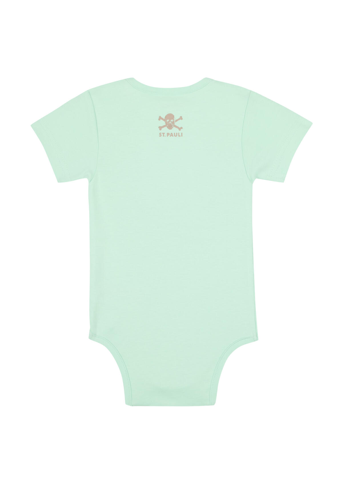 Basic Baby Body in uni braun mit gedrucktem Vereinslogo. Schulterbereich mit Druckknöpfen.
