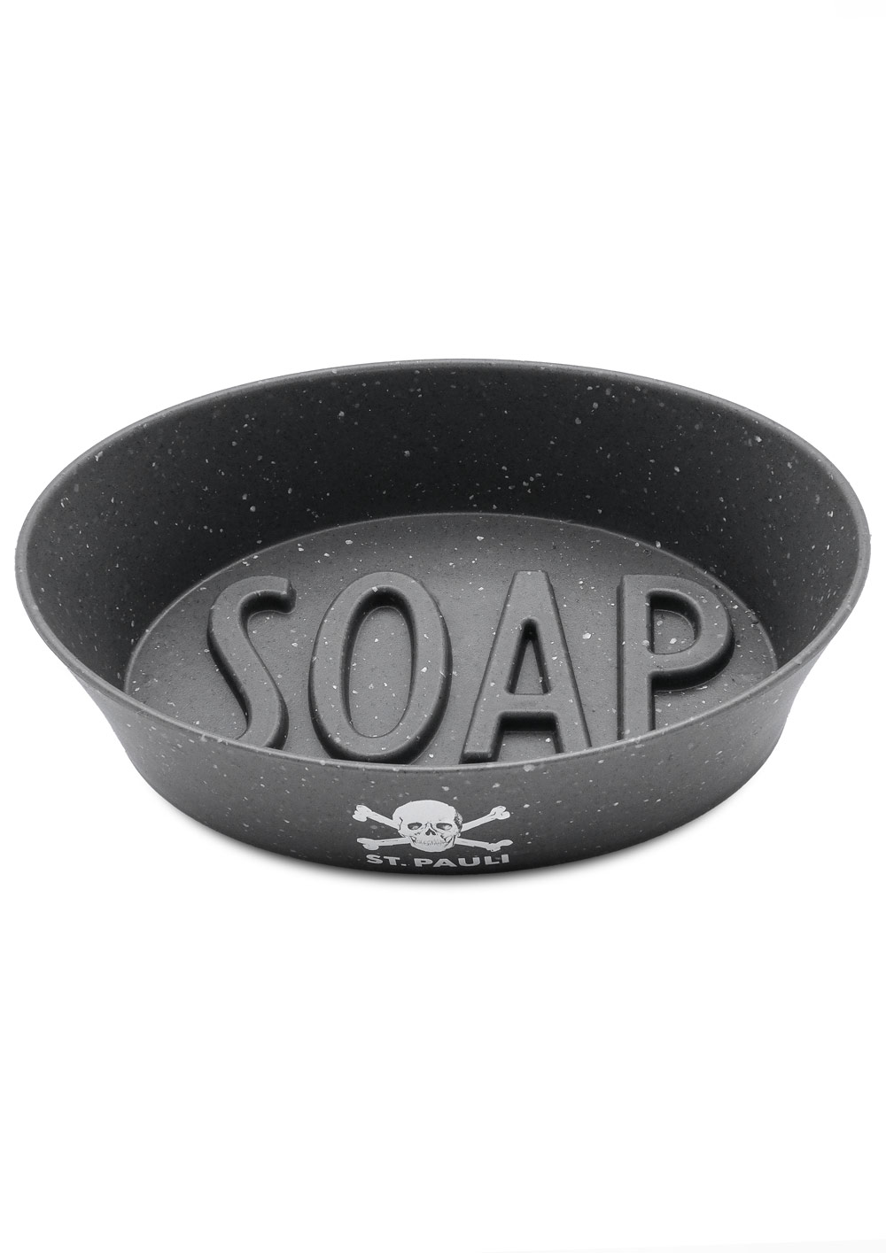 Graue Seifenschale mit Totenkopflogo aus 100% recyceltem Meeresplastik und Zellulose, gefertigt in Deutschland. Auf dem hochstehenden SOAP-Schriftzug trocknet deine Seife leichter und bleibt so länger verwendbar. Die große Auflagefläche verhindert das Wegrutschen auf glatten Waschbeckenrändern.
