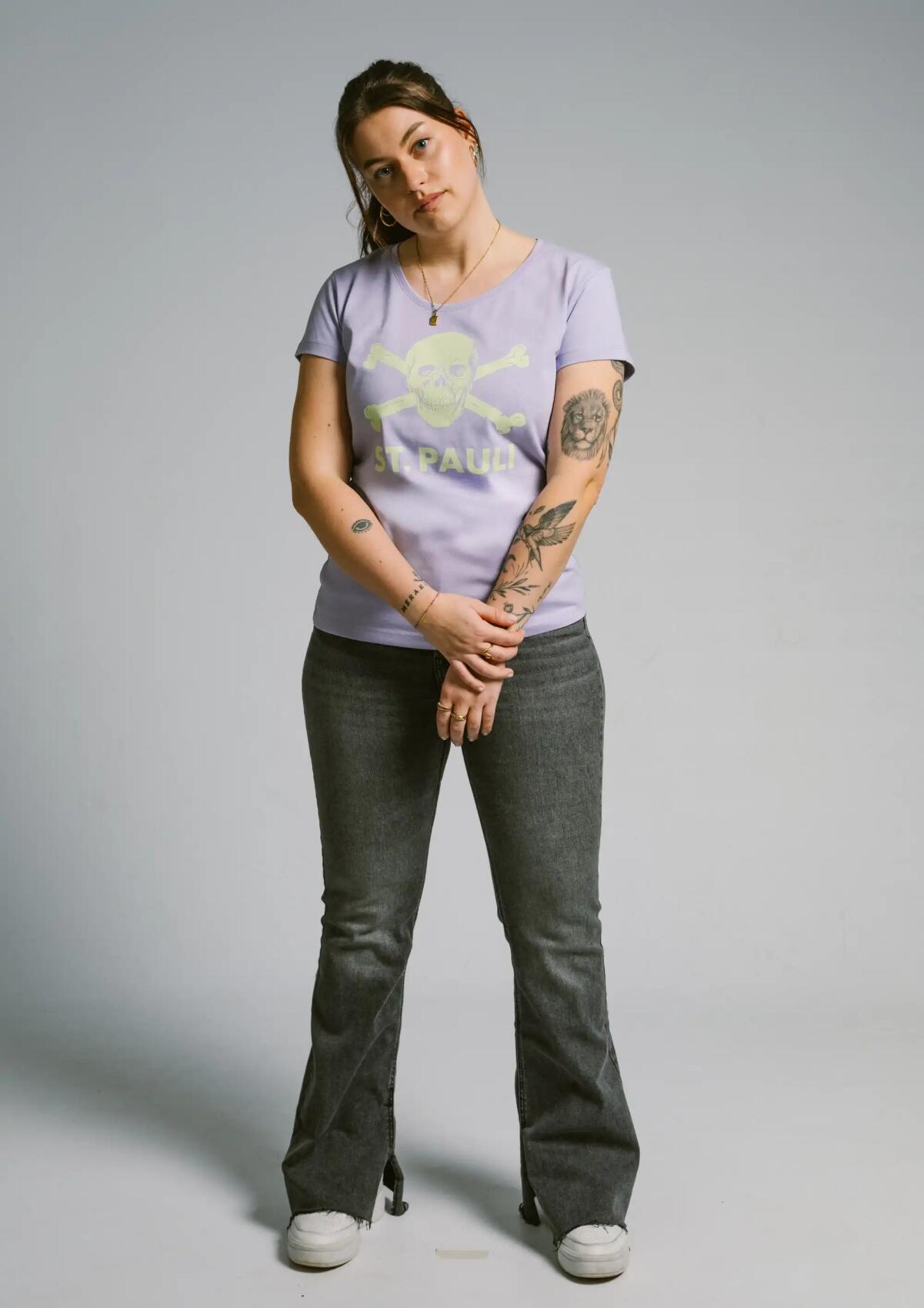 Das taillierte FC St. Pauli T-Shirt „Lavender / Lime“ verbindet klare Fan-Symbolik mit einer femininen, körpernahen Passform. Der Lavendelton bildet die ruhige Basis, während der Lime-farbene Totenkopf-Print auf der Vorderseite einen starken Kontrast setzt. Das klassische Skull-&-Crossbones-Motiv mit „ST. PAULI“ Schriftzug steht seit Jahrzehnten für die Haltung und Kultur rund um den Stadtteilclub.Der taillierte Schnitt und der etwas weiter ausgeschnittene Rundhalsausschnitt sorgen für eine moderne Silhouette und machen das Shirt zu einem vielseitigen Teil urbaner Fanwear. Ob im Stadion, im Alltag oder kombiniert mit Streetwear-Looks – das T-Shirt bringt die Symbolik des FC St. Pauli klar und reduziert auf den Punkt.Ein FC St. Pauli T-Shirt für alle, die Fußballkultur, klare Haltung und unkomplizierten Stil miteinander verbinden.