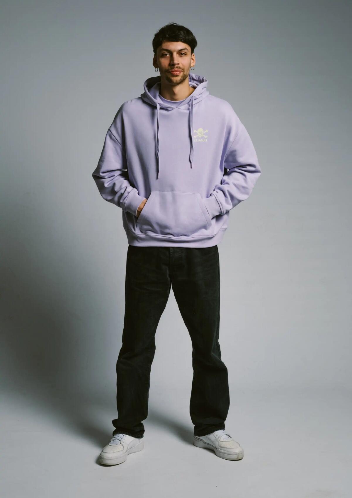 Der FC St. Pauli Kapuzenpullover „Lavender / Lime“ verbindet klare Streetwear-Ästhetik mit der unverwechselbaren Symbolik des Vereins. Der Hoodie kommt in einem ruhigen Lavendelton und setzt mit dem Totenkopf-Print in Lime einen bewussten Kontrast. Auf der Vorderseite erscheint das klassische FC St. Pauli Totenkopf-Logo dezent auf der Brust, während auf dem Rücken ein großflächiger Skull-&-Crossbones-Print mit „ST. PAULI“ Schriftzug die Haltung des Clubs sichtbar macht.Der Kapuzenpullover steht für urbane Fußballkultur und eine klare Haltung abseits des Spielfelds. Die Kombination aus auffälligem Rückenprint und reduziertem Frontlogo macht ihn zu einem vielseitigen Begleiter – im Stadion, auf der Straße oder im Alltag. Kapuze mit Kordelzug, Kängurutasche und gerippte Bündchen sorgen für den klassischen Hoodie-Look und funktionalen Komfort.Ein FC St. Pauli Hoodie für alle, die Fußballkultur, Streetwear und klare Symbolik miteinander verbinden.