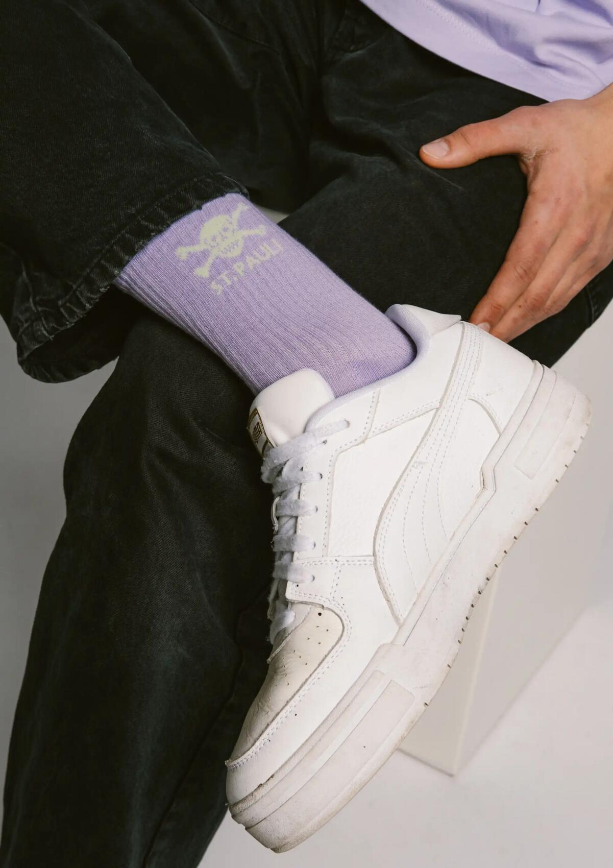 Die FC St. Pauli Socken „Lavender / Lime“ bringen die ikonische Totenkopf-Symbolik in ein klares Alltags-Essential. Der Lavendelton bildet die ruhige Basis, während das Lime-farbene Totenkopf-Logo mit „ST. PAULI“ Schriftzug am Schaft einen markanten Kontrast setzt. Reduziert im Design, aber eindeutig in der Aussage – typisch FC St. Pauli.Der klassische Crew-Socken-Schnitt mit geripptem Schaft sorgt für einen sicheren Sitz und angenehmen Tragekomfort im Alltag. Ob im Stadion, auf der Straße oder im täglichen Einsatz – die Socken lassen sich unkompliziert kombinieren und setzen ein dezentes Zeichen für die besondere Fußballkultur rund um den Kiezclub.Ein schlichtes, funktionales Fan-Essential mit klarer FCSP-Symbolik.
