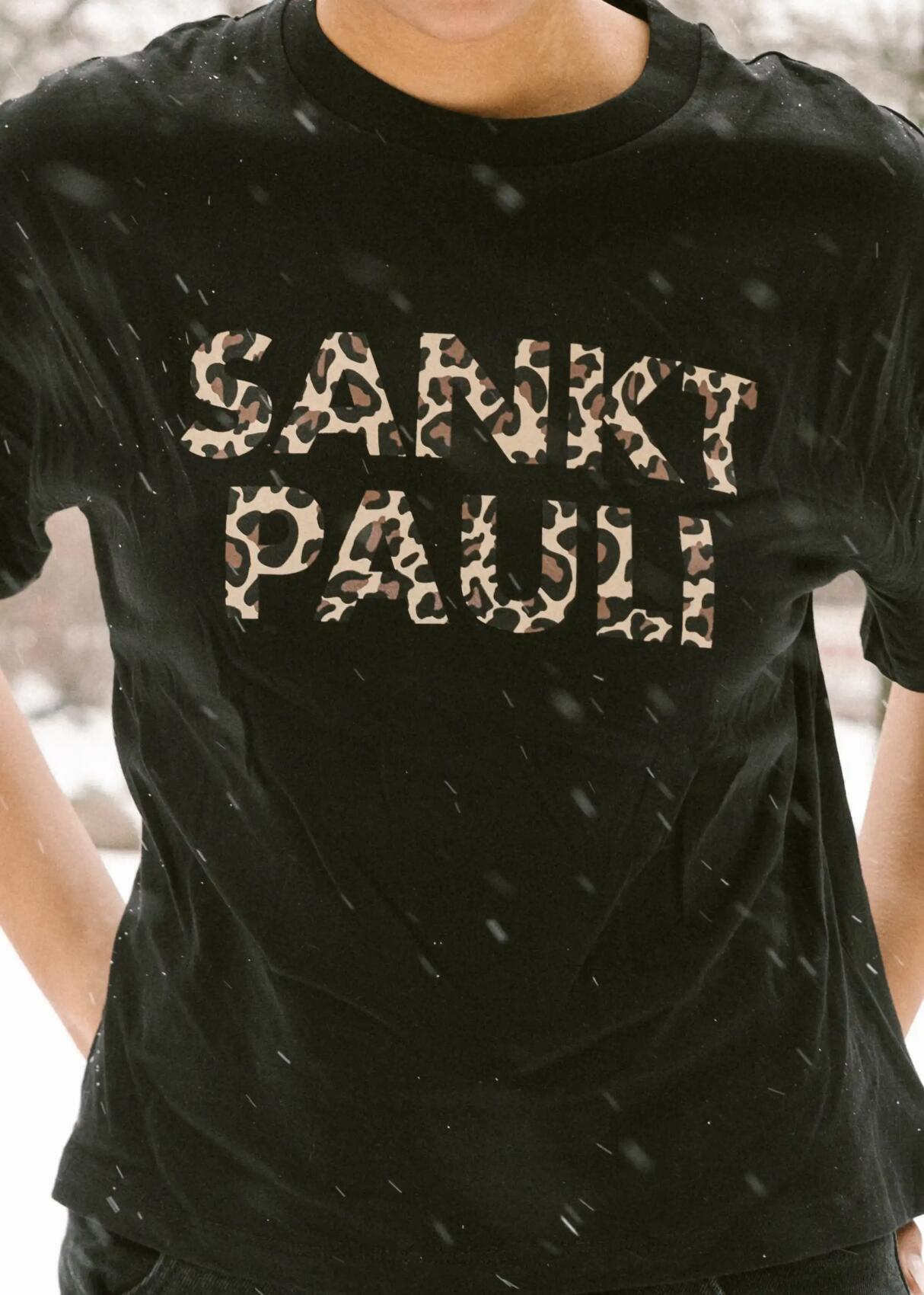 Das FC St. Pauli T-Shirt „Totenkopf Leo“ in Schwarz verbindet zwei prägende Elemente der Club-DNA: den Totenkopf und eine selbstbewusste Leo-Optik. Auf der Vorderseite setzt ein reduzierter „SANKT PAULI“-Print auf Brusthöhe ein klares, minimalistisches Statement. Die Rückseite trägt den ikonischen Totenkopf mit gekreuzten Knochen im markanten Leo-Design – ergänzt durch den „ST. PAULI“-Schriftzug.Der Kontrast aus schwarzem Shirt und braun-beigem Animal-Print greift die Vereinsfarben subtil auf und übersetzt sie in einen urbanen Streetwear-Look. Mit klassischem Rundhalsausschnitt und geradem Schnitt ist dieses FC St. Pauli T-Shirt vielseitig kombinierbar – solo getragen oder im Layering. Ein Statement-Piece für alle, die Haltung zeigen und Fußballkultur sichtbar machen.