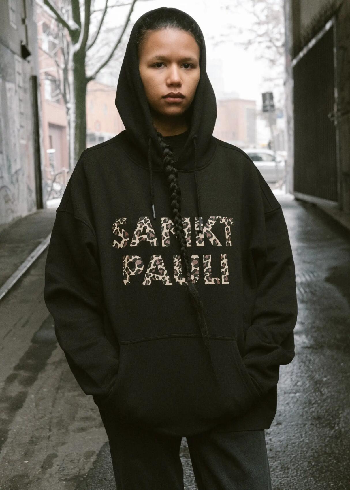 Der FC St. Pauli Hoodie „SANKT PAULI Leo“ in Schwarz bringt ein markantes Statement auf schweren Stoff. Der großflächige „SANKT PAULI“-Frontprint im selbstbewussten Leo-Design verbindet provokante Streetwear-Ästhetik mit klarer Clubhaltung. Die Kombination aus schwarzer Basis und braun-beigem Animal-Print greift die Vereinsfarben auf und übersetzt sie in einen kraftvollen, urbanen Look.Auf der Rückseite setzt ein dezentes Totenkopf-Detail mit „ST. PAULI“-Schriftzug im Nackenbereich einen klaren Bezug zur Fußballkultur am Millerntor. Mit Kapuze, Kängurutasche und breiten Rippbündchen steht der FC St. Pauli Hoody für Komfort und Alltagstauglichkeit – ob am Spieltag, im Viertel oder unterwegs in der Stadt. Ein starkes Piece für alle, die FCSP sichtbar tragen.