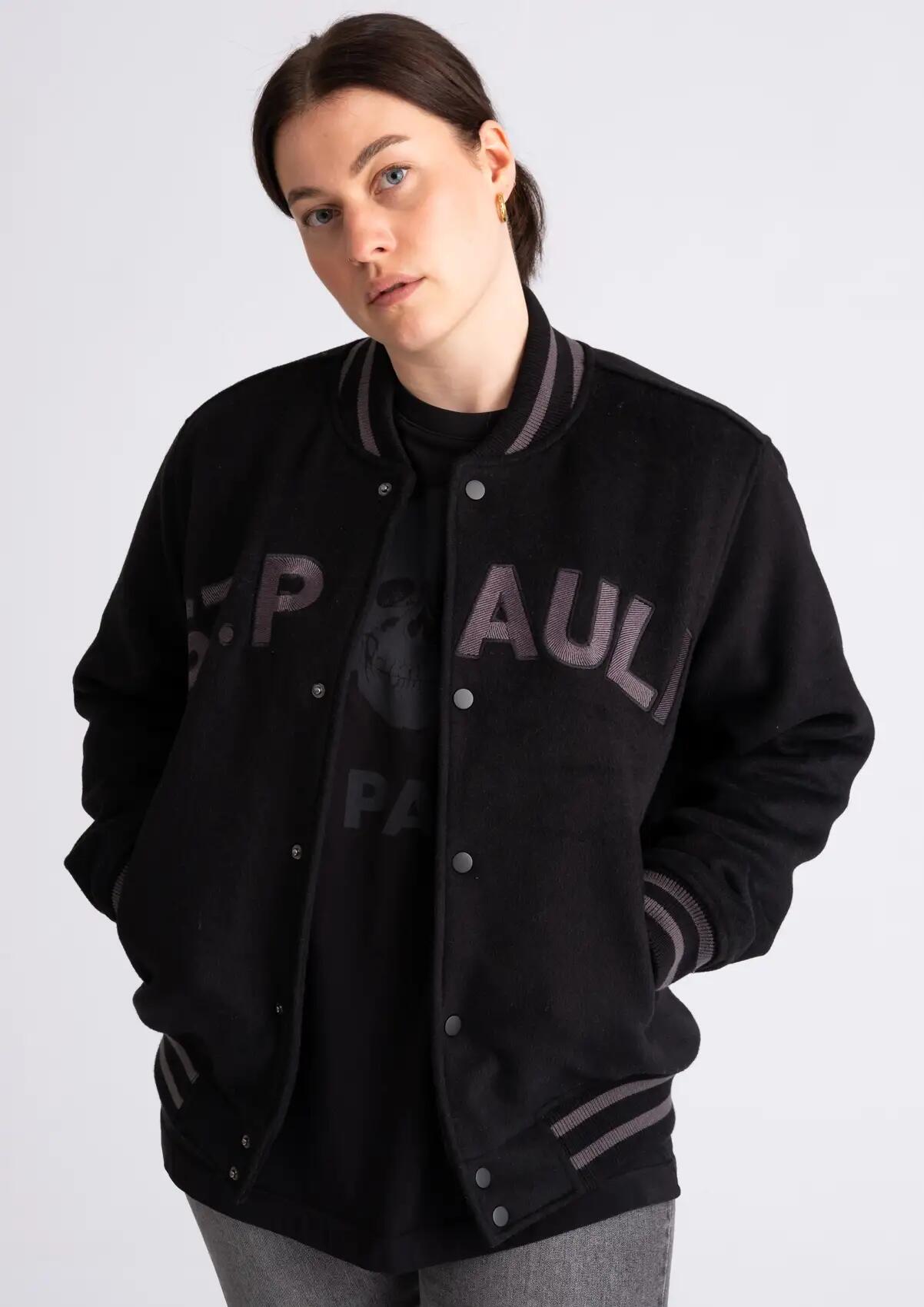 Schwarz, stark, kompromisslos: Die Collegejacke "St. Pauli" steht für klare Kante. Mit ST. PAULI Stick vorn und Totenkopf hinten zeigst du, wo du hingehörst. Der robuste Filzstoff und das gesteppte Innenfutter halten warm – egal, wie rau es draußen wird. Lockerer Schnitt, der sitzt. Für alle, die Haltung zeigen und schwarz tragen – Tag für Tag.