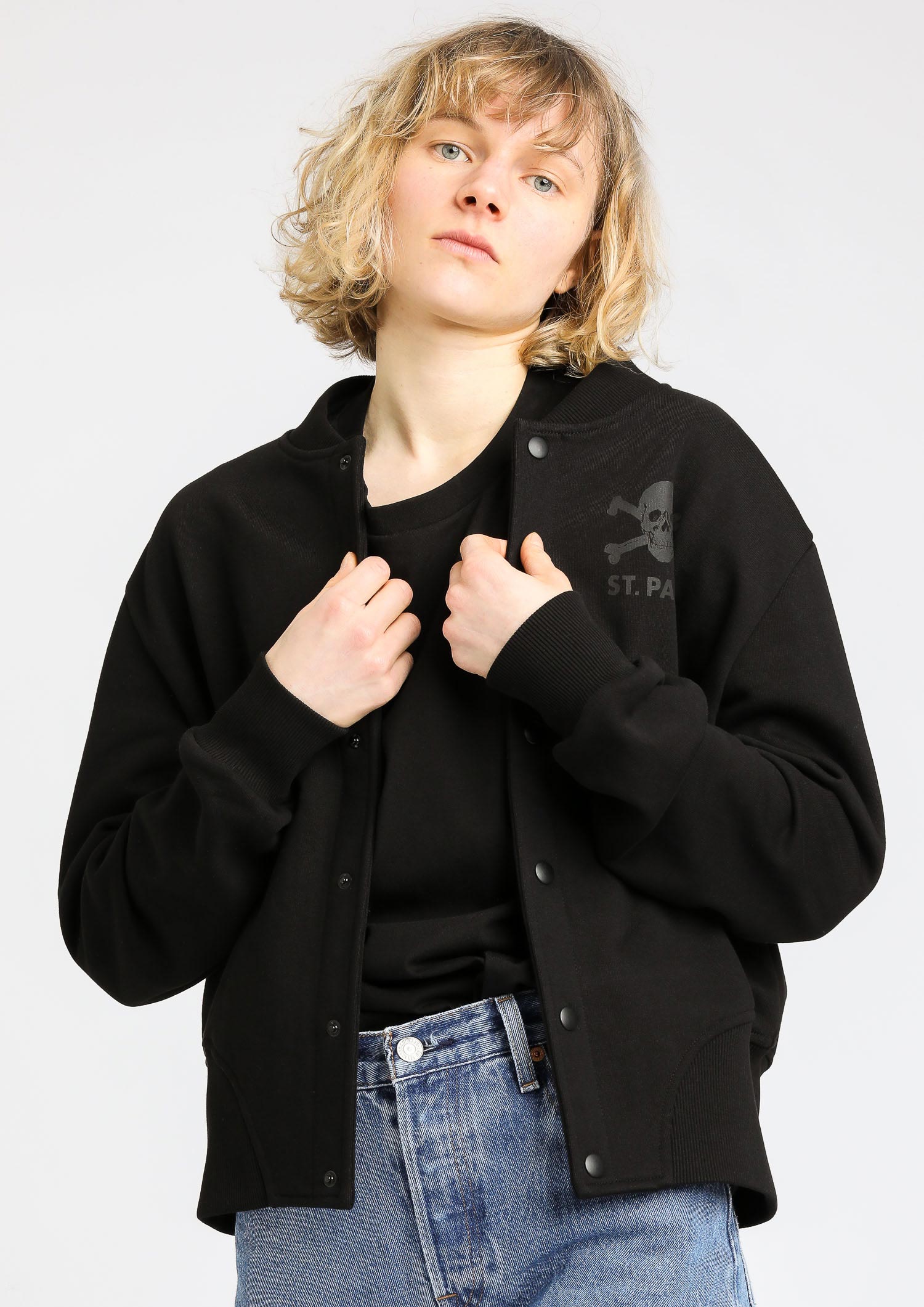 Die FC St. Pauli Collegejacke "All Black" im taillierten Schnitt vereint minimalistischen Stil und ikonisches Design. Mit dem Ton-in-Ton Totenkopf-Print auf Brust und Rücken setzt die Jacke dezente, aber ausdrucksstarke Akzente. Der klassische College-Look mit geripptem Kragen, Bündchen und einem Druckknopfverschluss sorgt für einen perfekten Sitz und hohen Tragekomfort. Hergestellt aus hochwertigem Material, ist diese Jacke ein Must-Have für Fans, die ihren Support für den FC St. Pauli mit Stil zeigen möchten.