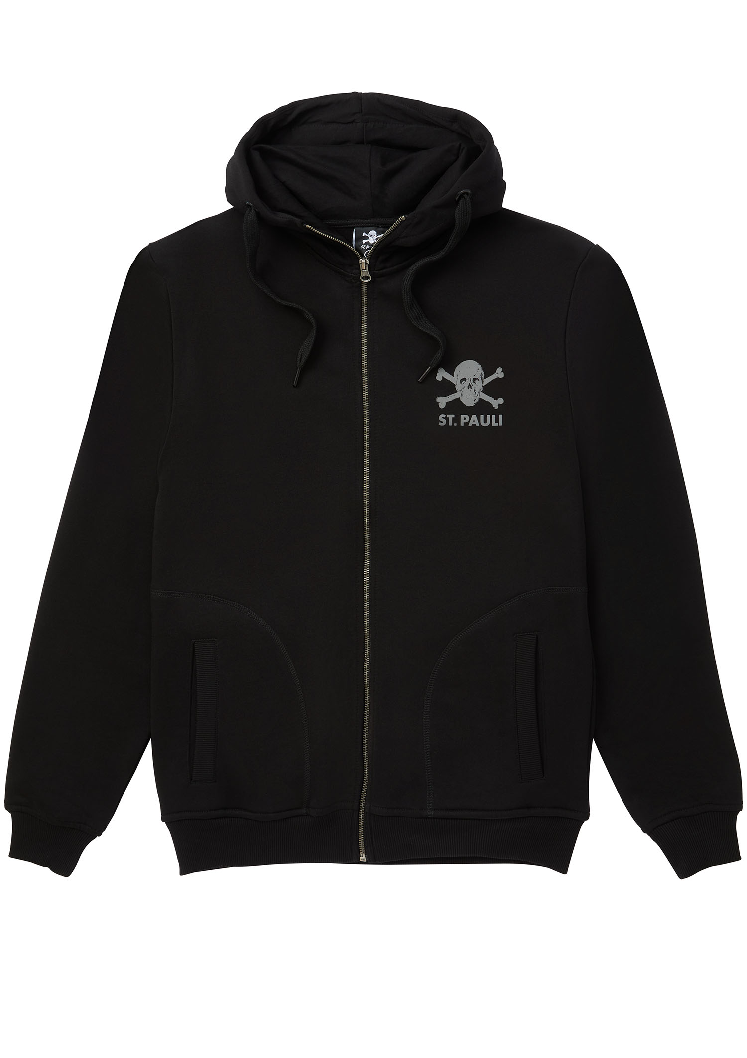 Diese schwarze Kapuzenjacke mit dem Totenkopf-Logo ist der perfekte Begleiter für jeden St. Pauli-Fan. Lässig, schlicht und voll im St. Pauli-Style: Auf der Vorderseite prangt das Totenkopf-Logo dezent auf der Brust, während es auf der Rückseite groß zur Geltung kommt. Der durchgehende Reißverschluss und die bequeme Kapuze sorgen für einen coolen Look, ideal für jede Gelegenheit – ob im Stadion, in der Stadt oder unterwegs. Ein echtes Statement-Piece!