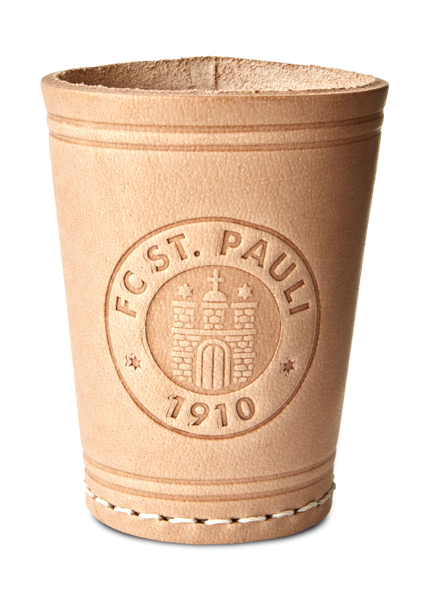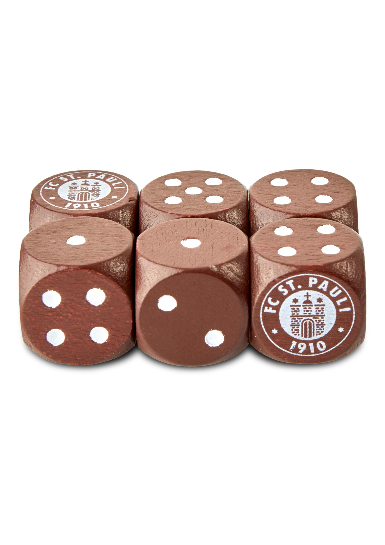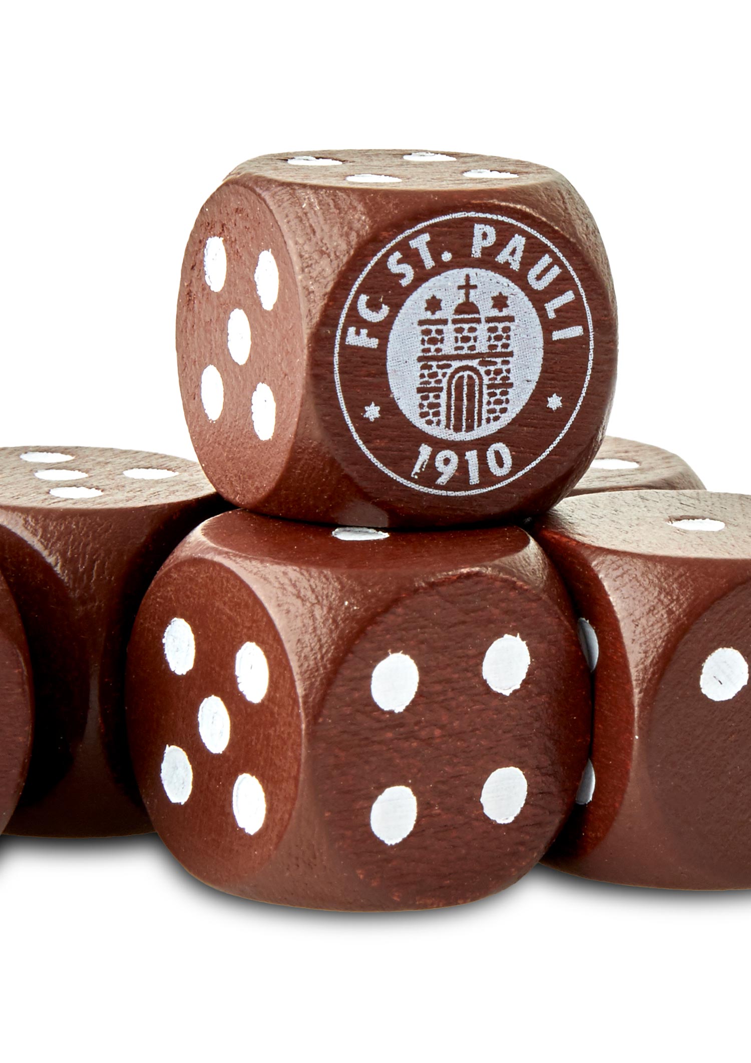 Handy dice cup with the FC ST. PAULI club crest, made of leather and without chrome. The six eye dice in classic white-brown are made of sustainable, FSC-certified wood. With the club crest instead of the "six" is also always an extra portion of luck in the cup.