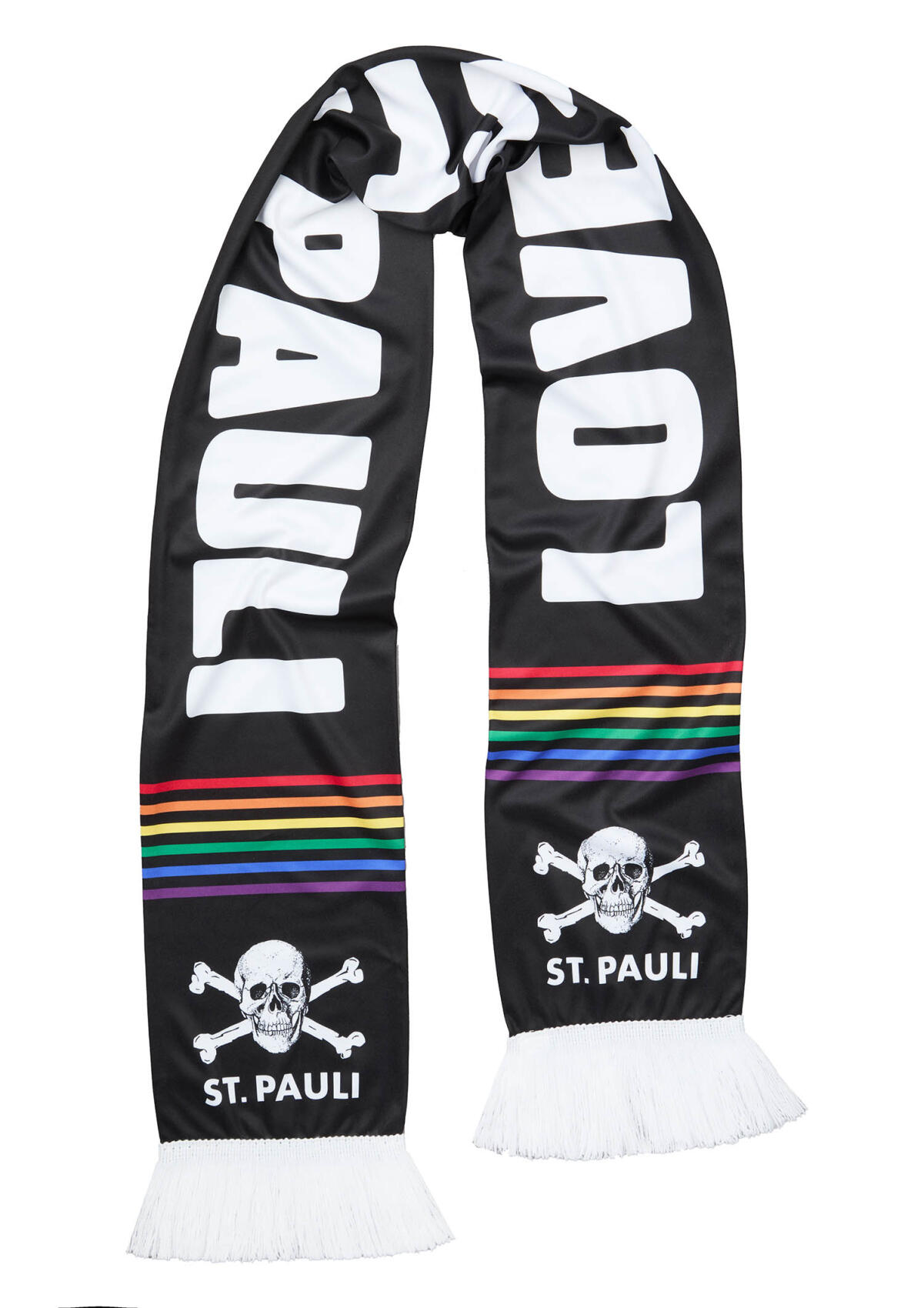 Make a bold statement with the FC St. Pauli Silk Scarf Love! This lightweight, thin black scarf features the slogans "LOVE ST. PAULI" and "HATE RACISM" with rainbow stripes and the iconic skull design. Ideal for match days and everyday wear. Made from 100% recycled polyester – sustainable and full of attitude.