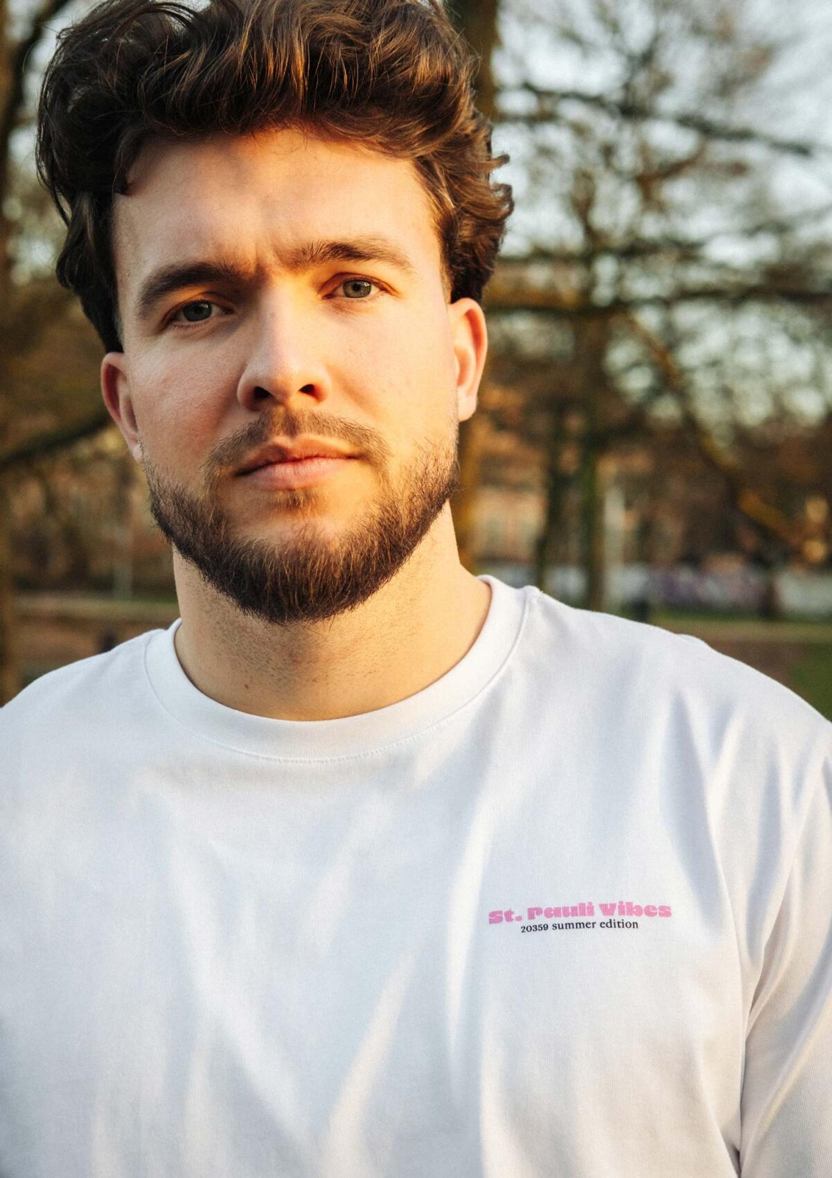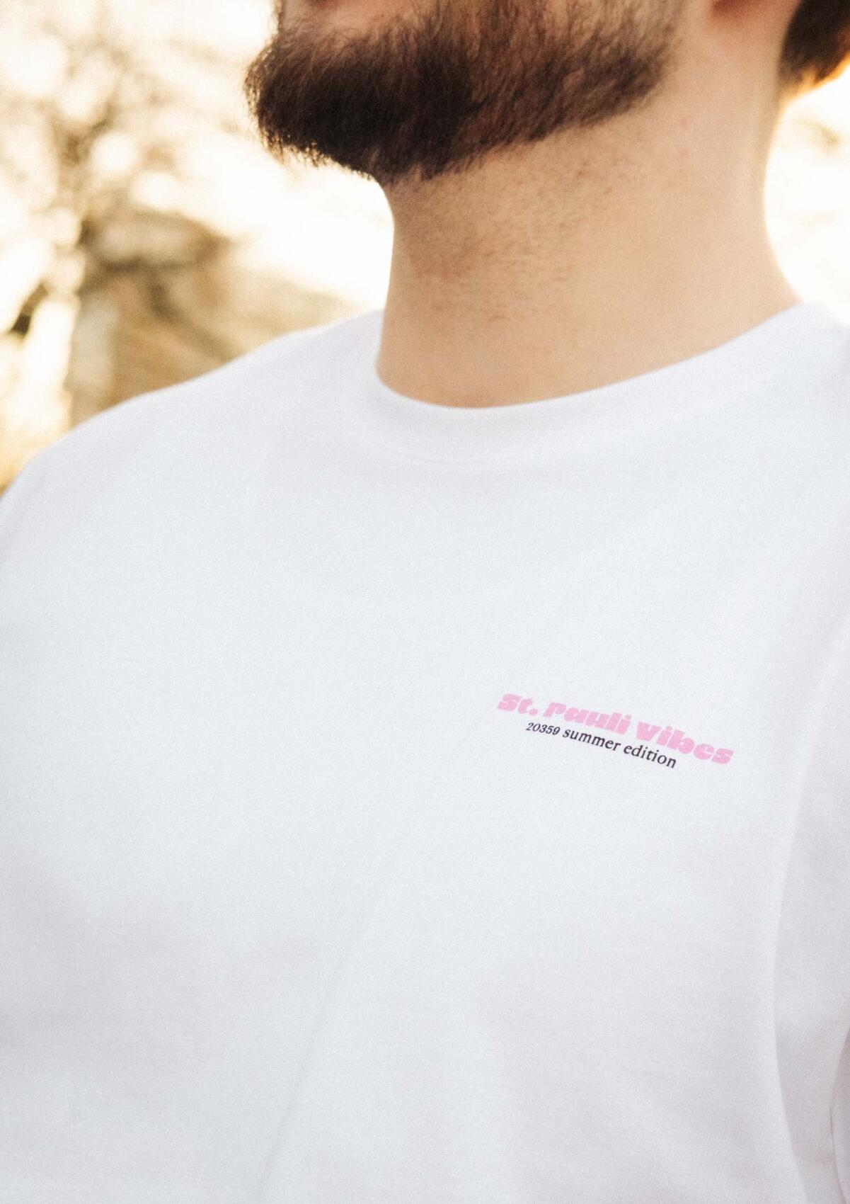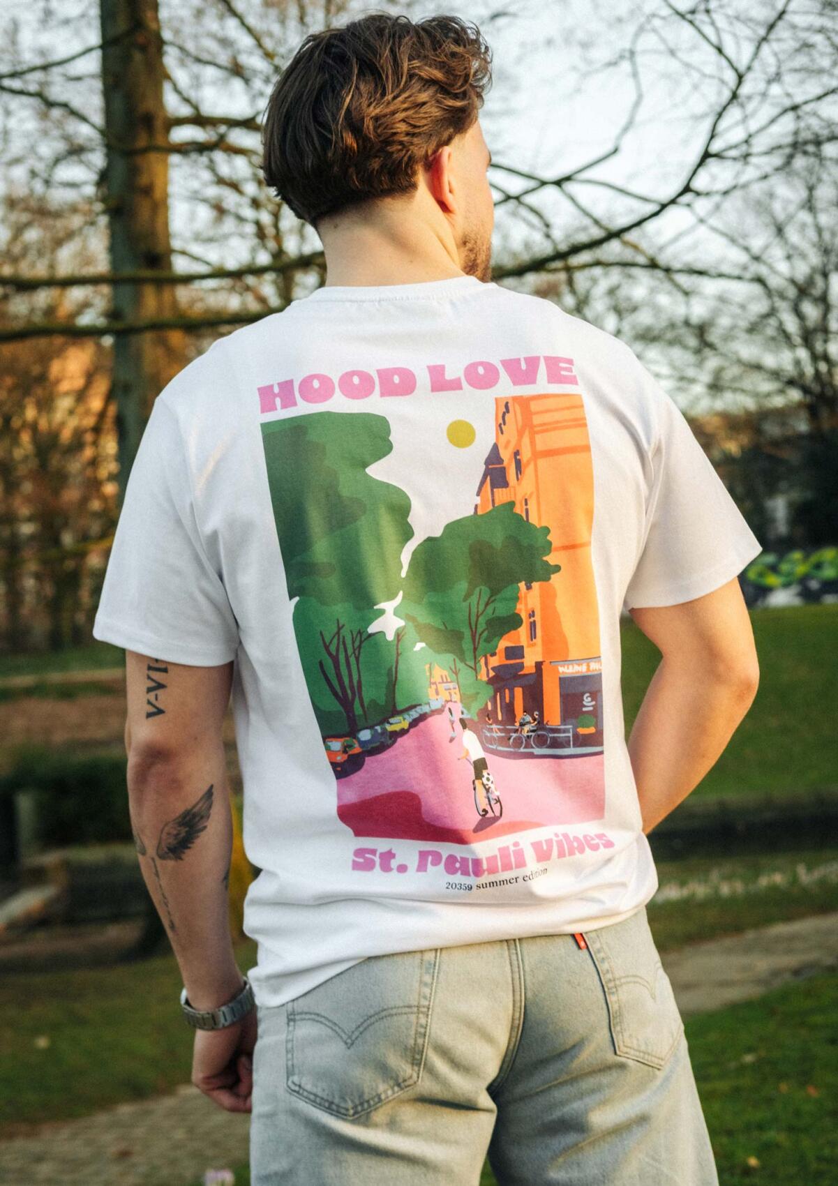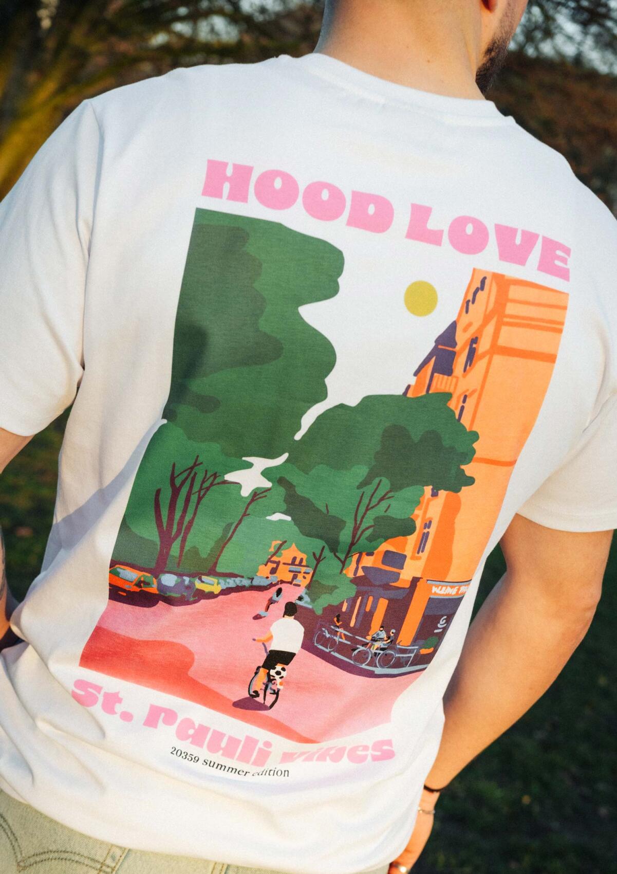 The “HOOD LOVE” T-shirt from the Summer Vibes collection captures movement in the neighborhood. Riding a bike through Hamburg-Mitte, taking a short break, then moving on—reflected in the colorful back print. Minimal front, relaxed cut. Summer, city, FC St. Pauli.