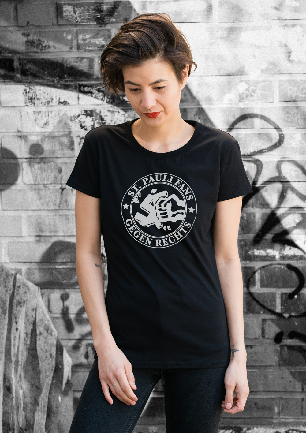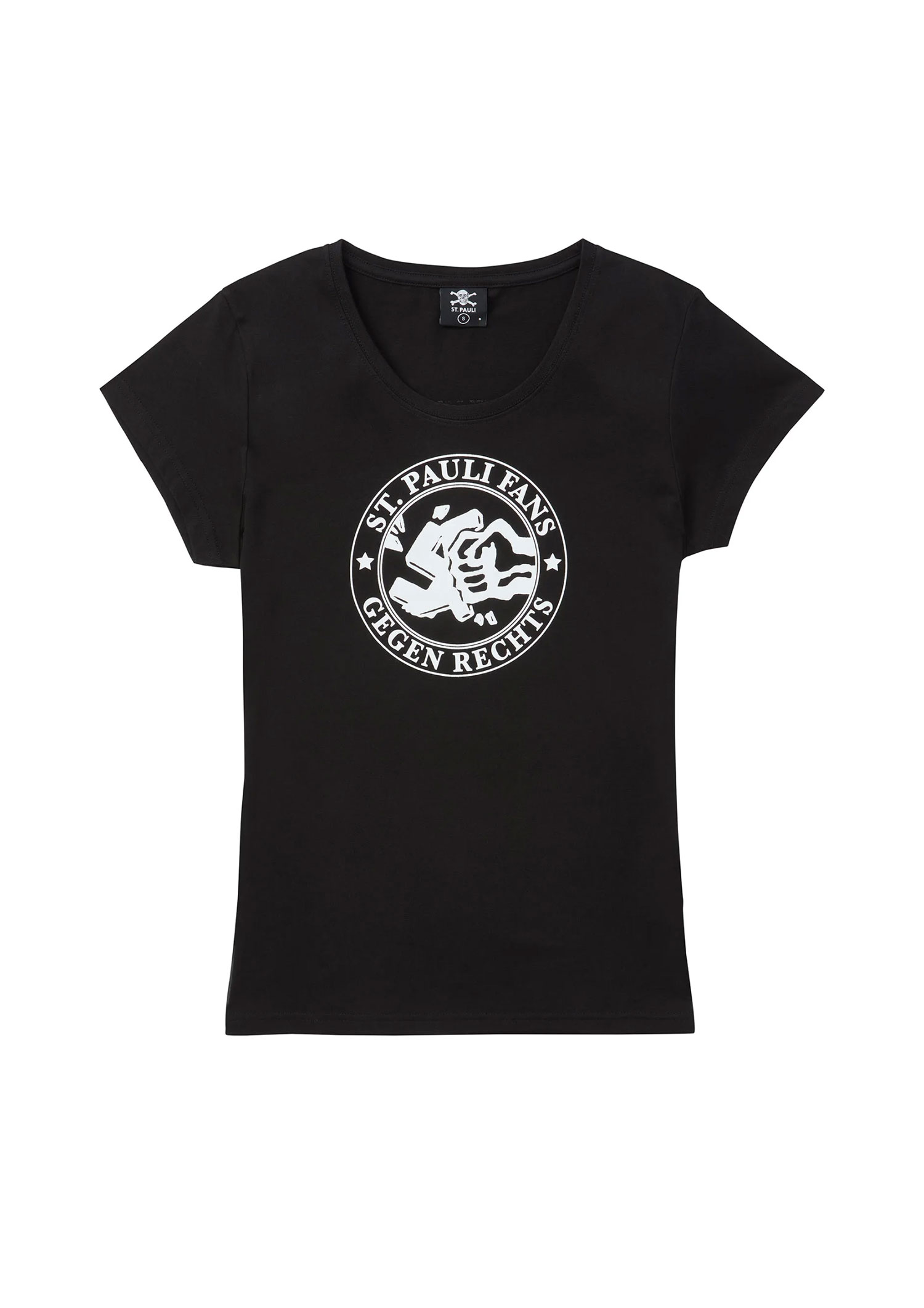 Make a bold statement with the fitted "Anti Fascist Black" T-shirt. In deep black with a striking print, this shirt embodies FC St. Pauli's core values. Featuring the iconic skull and crossbones alongside the "Anti-Fascist" slogan, this tee blends style with conviction. Its feminine fit and comfortable fabric make it perfect for fans who wear their beliefs with pride.