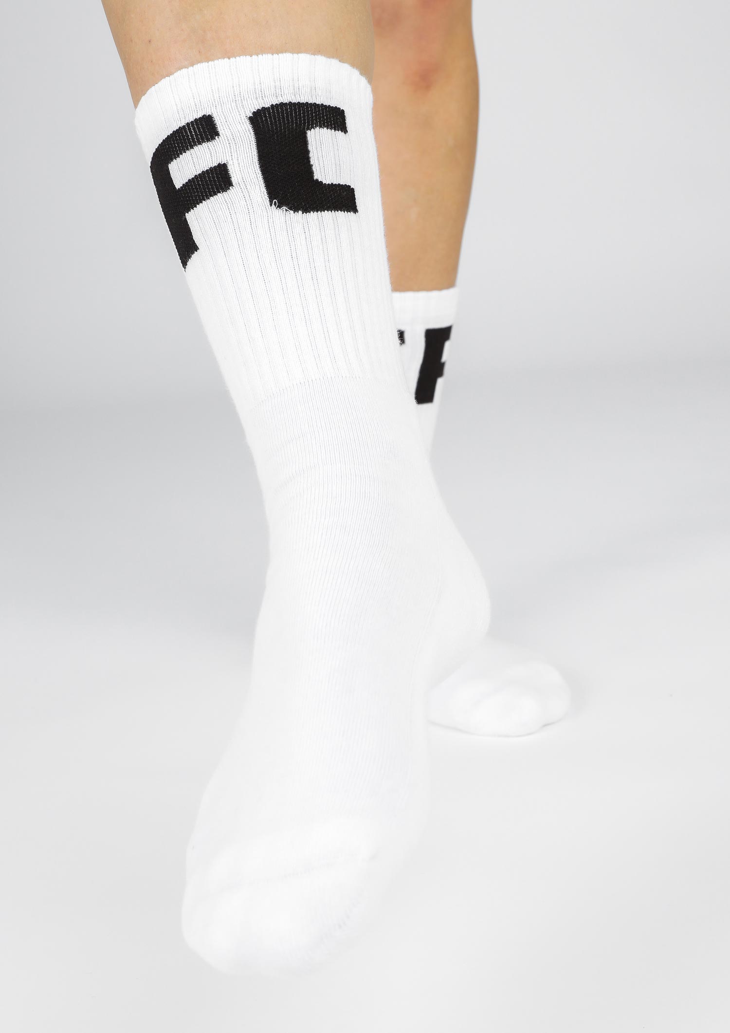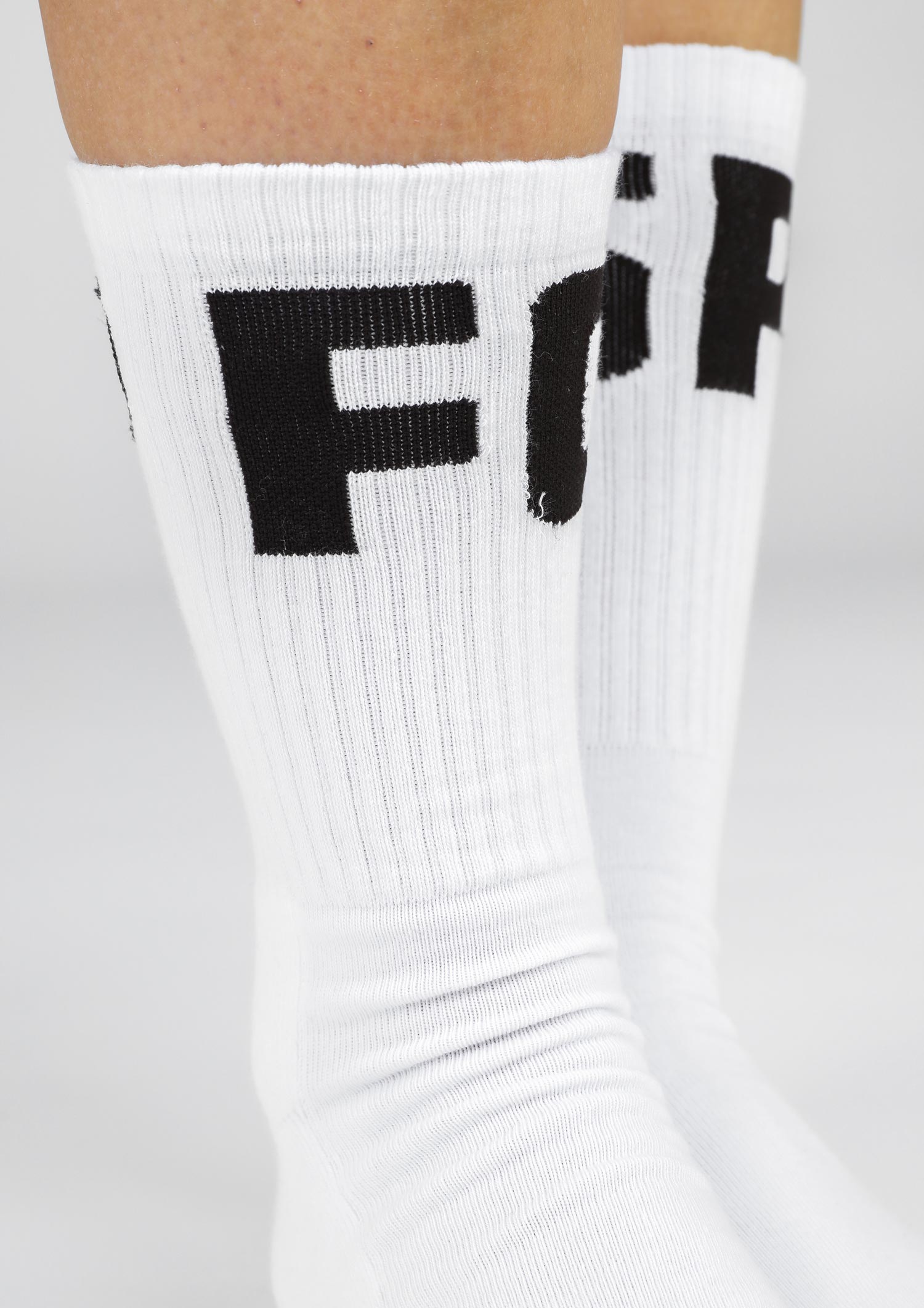 Always Anti-Fascist: White tennis socks with a meaningful FCSP basic stance as woven-in lettering. The socks are made of 82% organic cotton and are particularly flexible and durable thanks to the added blend of polyamide and elastane, as well as being sustainably produced in Turkey.