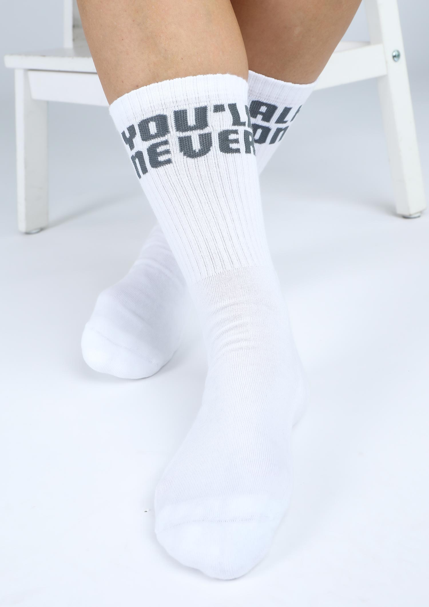 For always and for you: Classic tennis socks in white with You'll never walk alone lettering in grey jaquard weave at the cuff. The socks are made of 80% organic cotton and are particularly stretchy and durable thanks to the combination of polypropylene and Lycra.