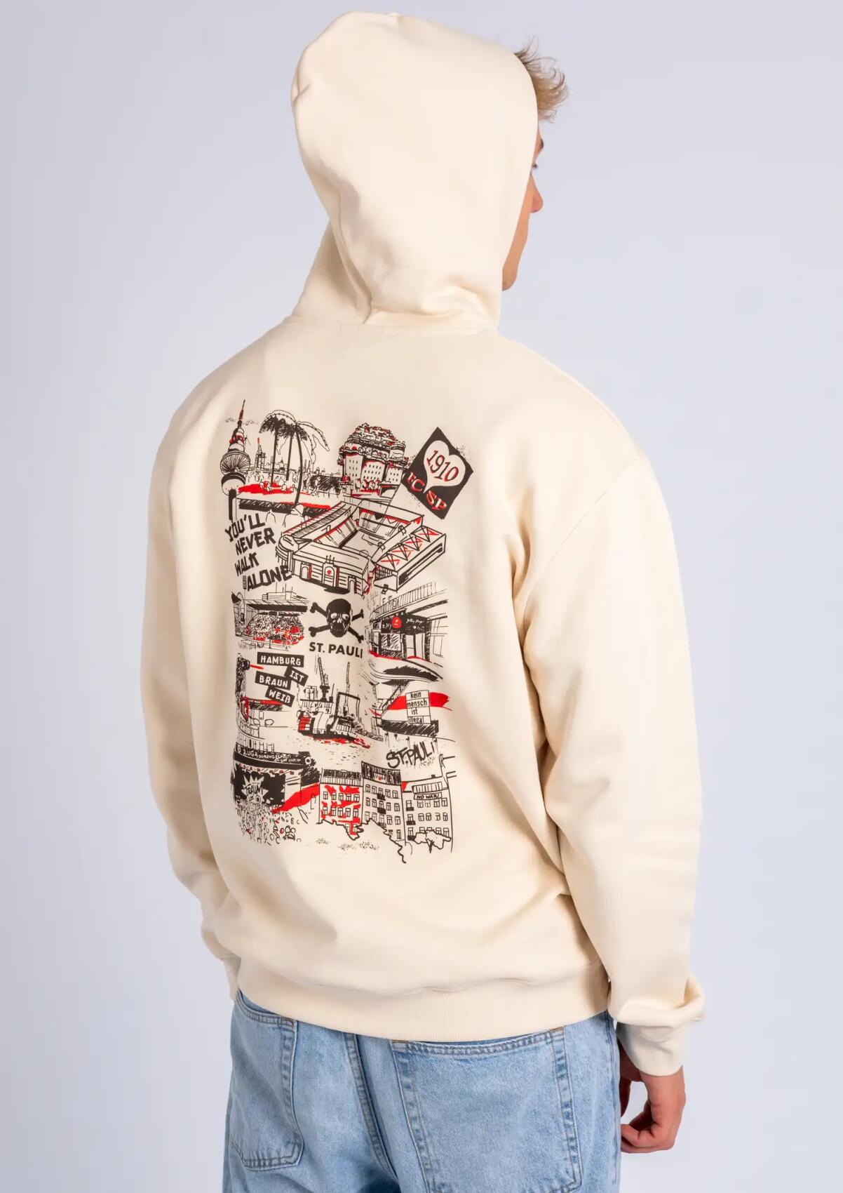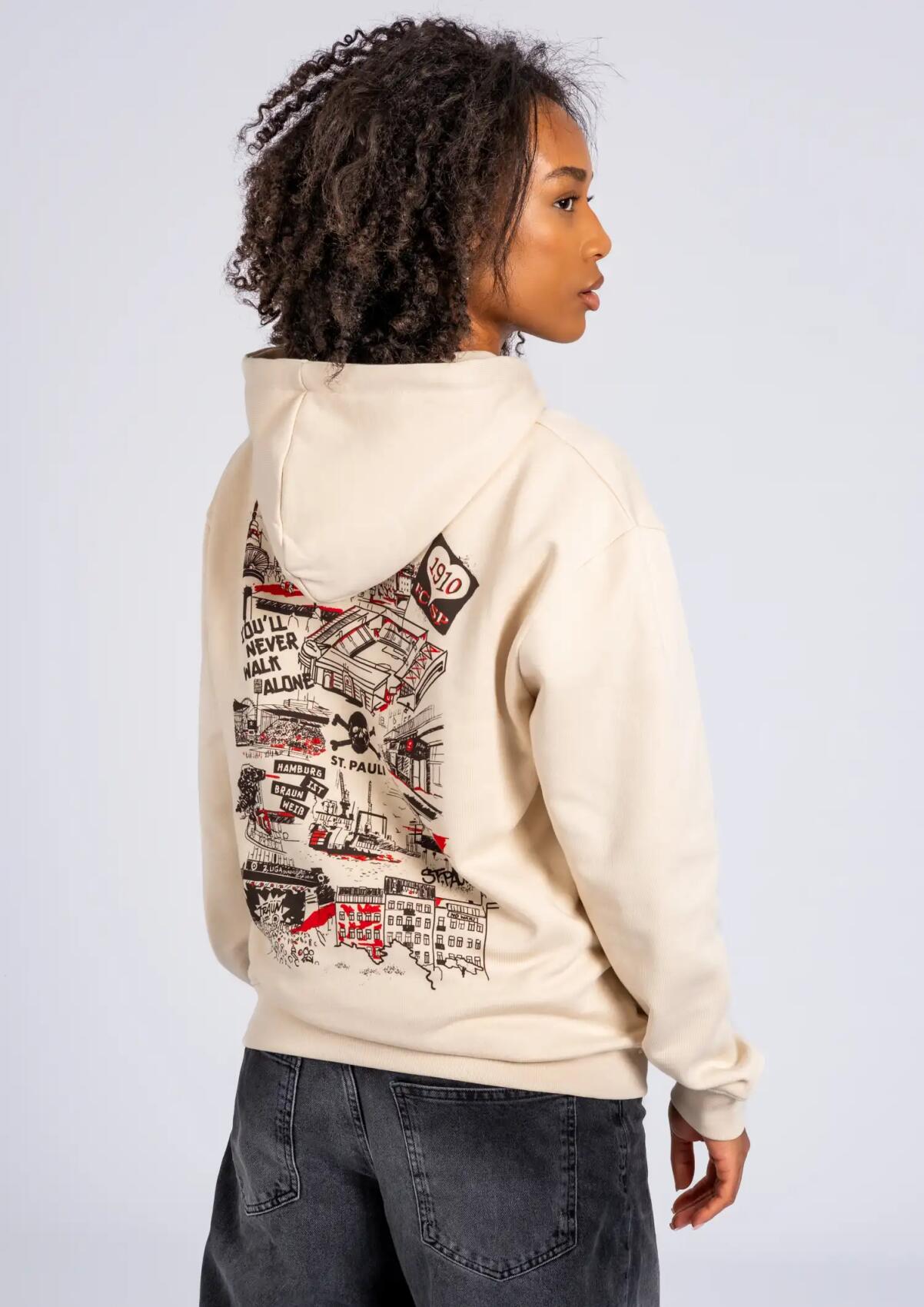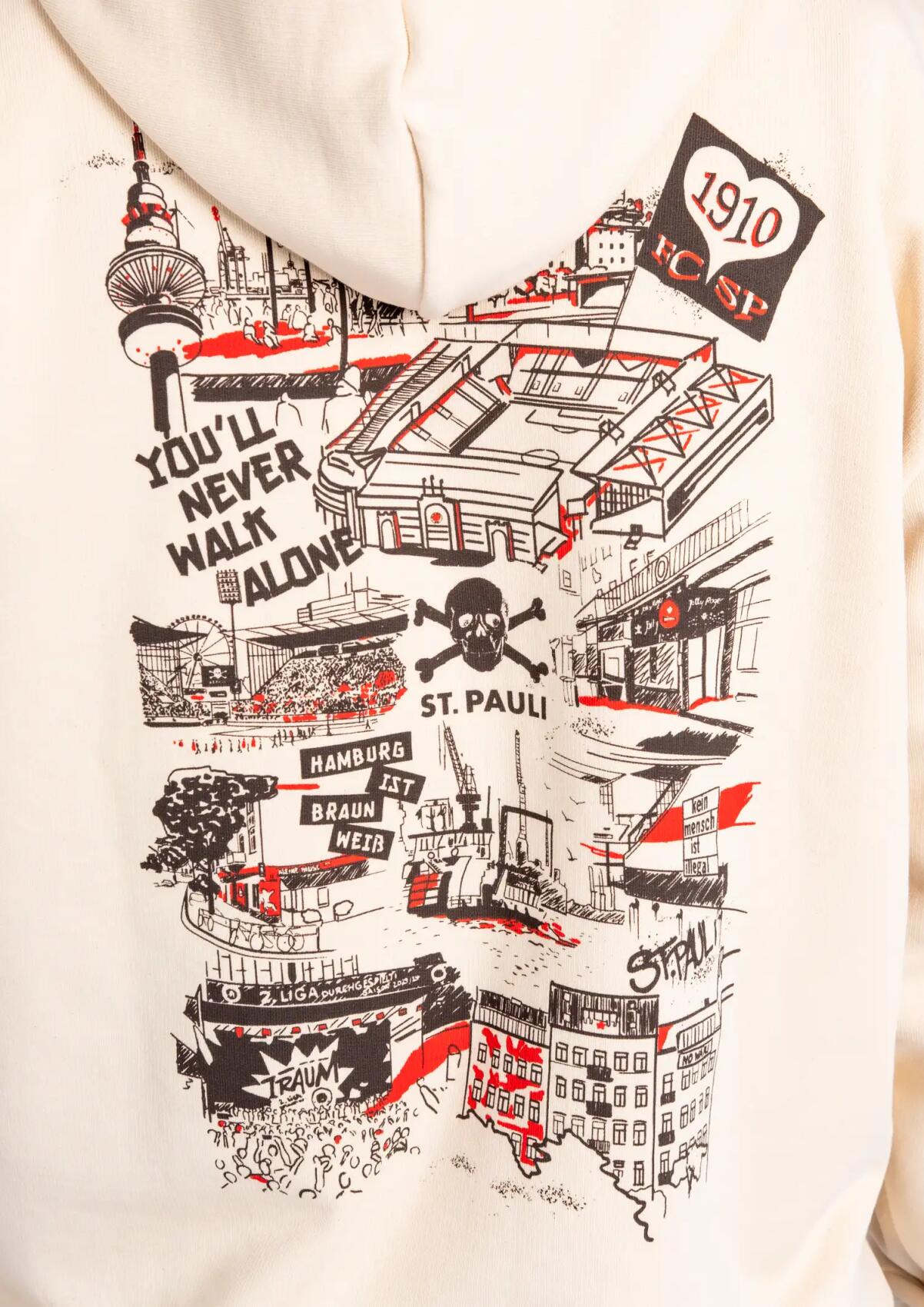 Zeig, wo du herkommst! Der FC St. Pauli Kapuzenpullover „Viertel“ bringt den Spirit des Stadtteils auf deinen Rücken. Der großflächige Backprint vereint alles, was den Stadtteil und den Verein ausmacht: das Millerntor-Stadion, die Reeperbahn, Hafenflair und natürlich die Totenkopf-Flagge. Mit kleinen Details wie „You'll never walk alone“ und „Hamburg ist braun-weiß“ ist dieser Hoodie eine Hommage an die Kiezkultur. Vorne dezent mit kleinem Totenkopf-Logo und lockerem Fit für maximalen Komfort.