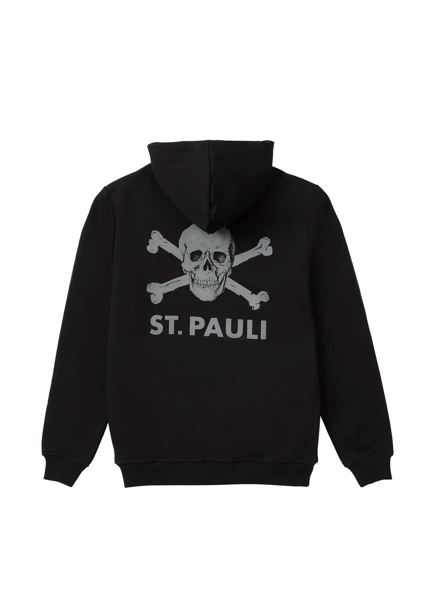 Klassiker Teil 2, fast, die Kids bekommen das ganze als Kapuzenjacke. Zu Fanladenzeiten hieß das einfach vorne klein-hinten groß. So ist es geblieben. Für alle, deren Totenkopf nicht sofort ins Gesicht springen soll. Frontdruck im Pocketformat, großer Rückendruck, alles im Siebdruckverfahren. Auf St.Pauli für St.Pauli entwickelt
