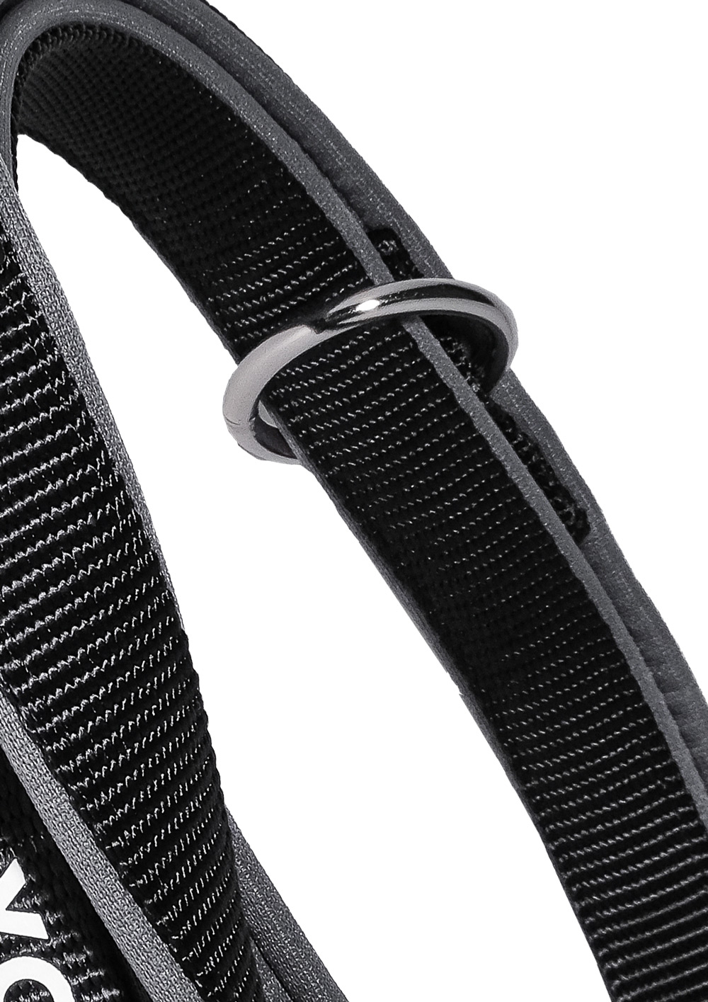 Schwarze Hundeleine aus Nylon mit 3-facher Verstellmöglichkeit auf eine Länge von 20 cm bis 200 cm.