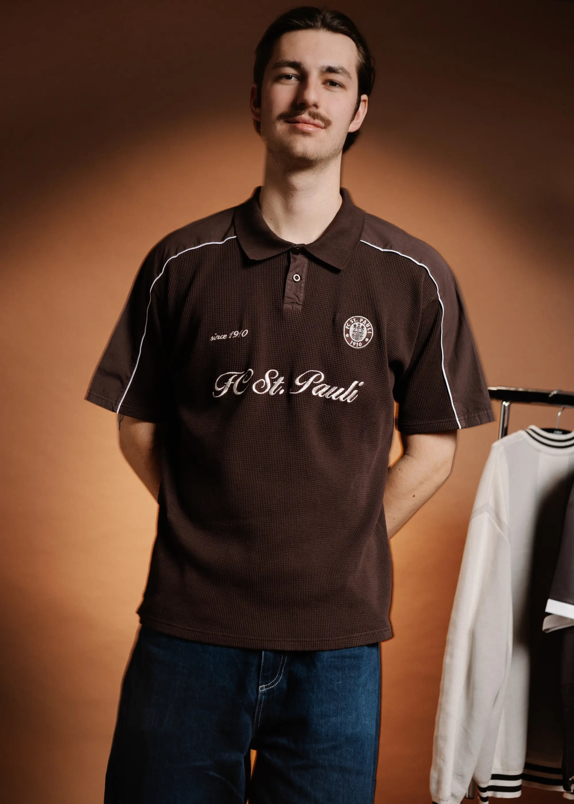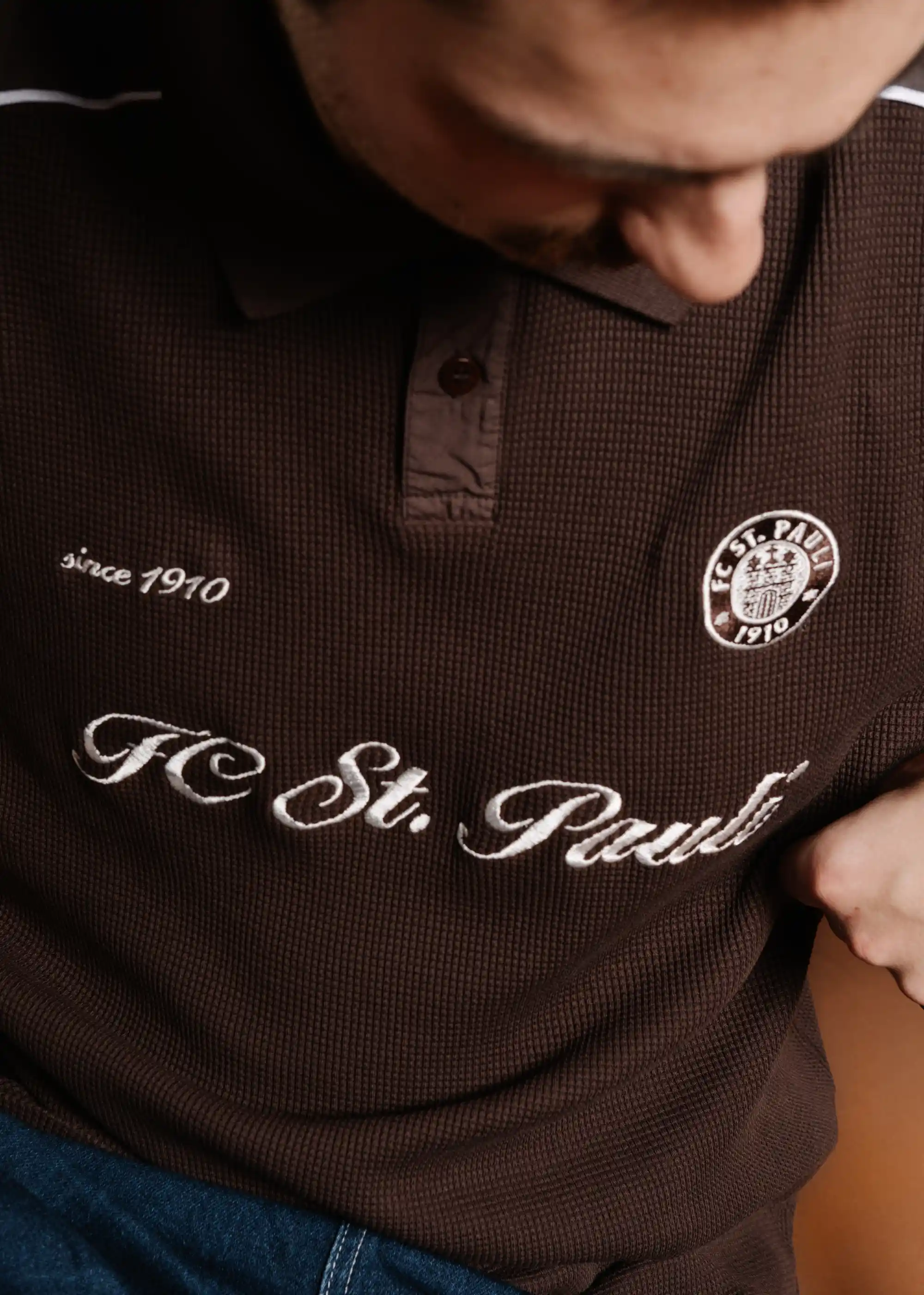 Der Polokragen mit Knopfleiste, feine Kontraststreifen entlang der Schultern und das dezente „since 1910“-Detail greifen Elemente historischer Football-Shirts auf. Dazu kommt das FC St. Pauli Vereinsbadge, das den Bezug zum Millerntor klar setzt.