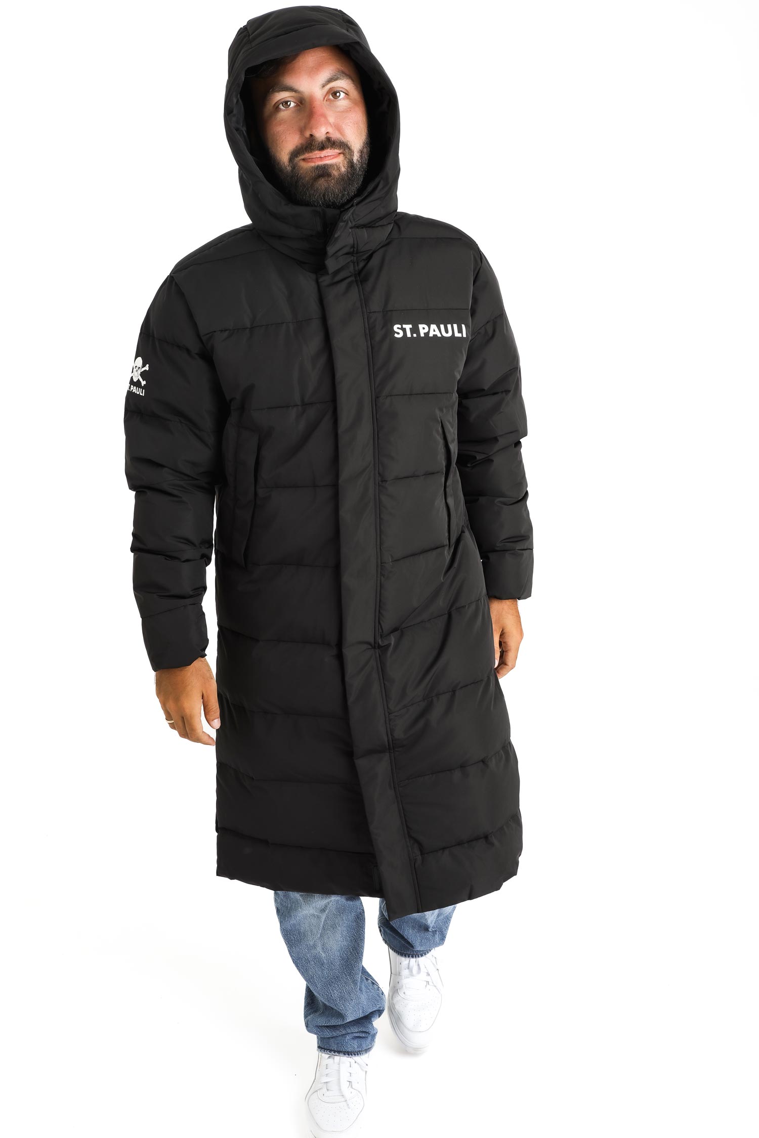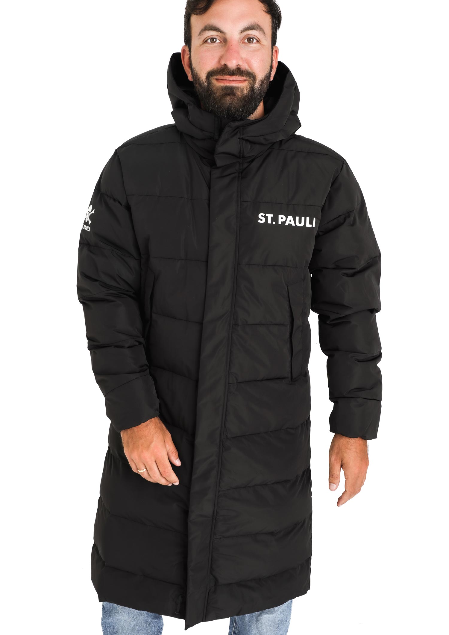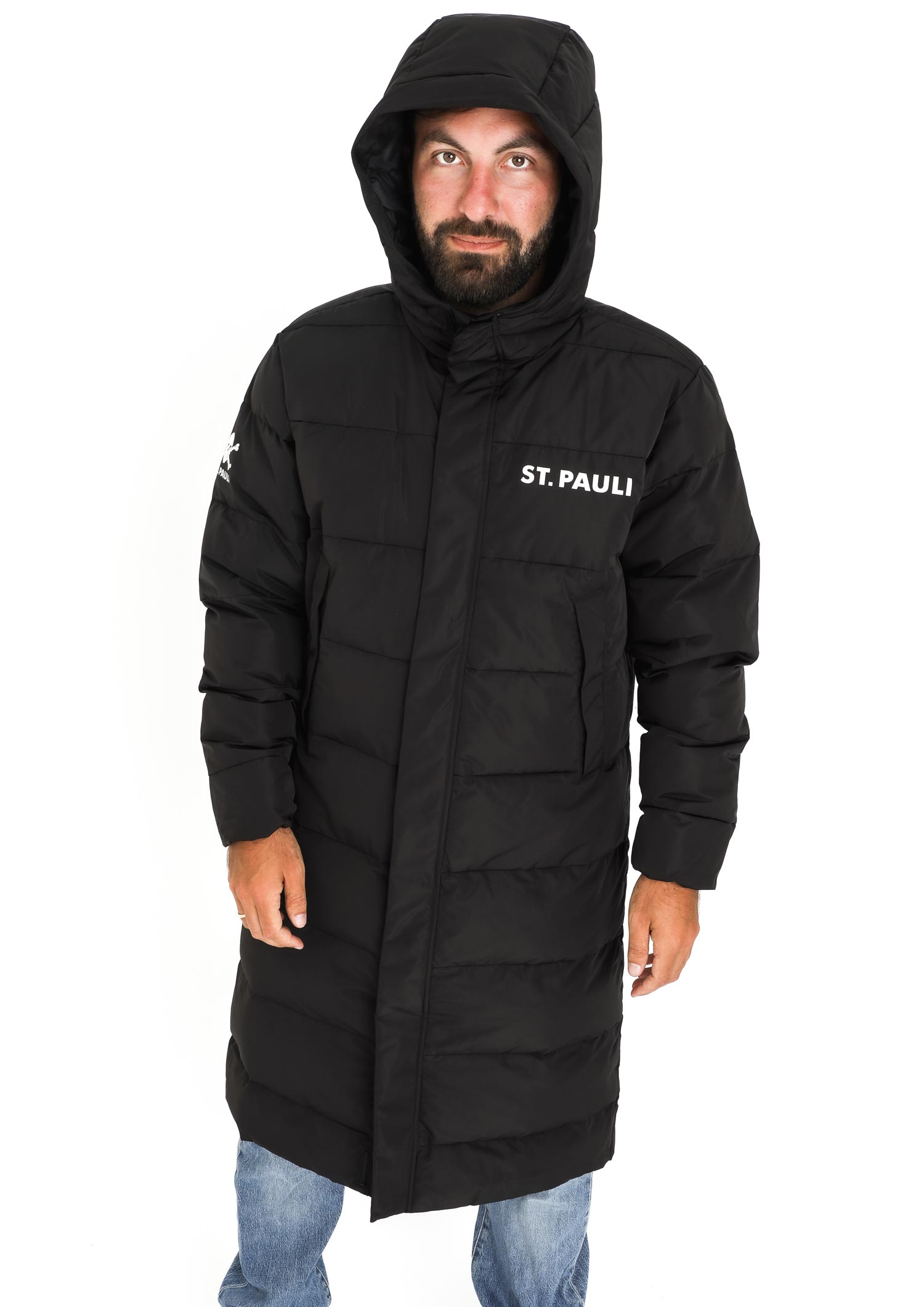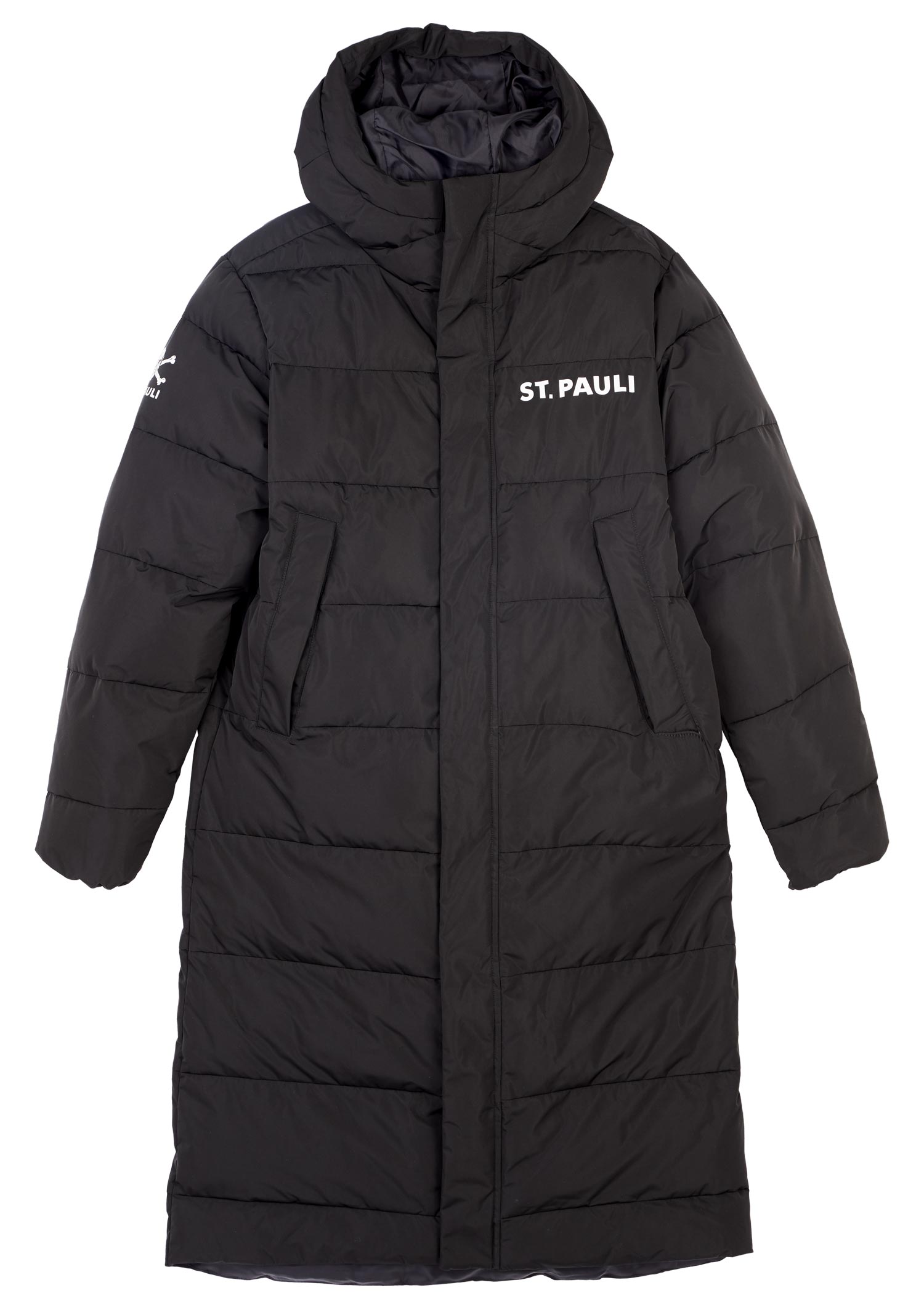 Unsere wadenlange, dick gefütterte Winterjacke mit ST. PAULI Schriftzug auf der Brust und Totenkopflogo auf dem Arm schützt dich zuverlässig vor Kälte, Nieselregen, Wind und allen weiteren Hamburger Wetterspezialitäten. Die große Kapuze, elastische Ärmelabschlüsse und ein verdeckter Zwei-Wege-Reißverschluss mit schützendem Stoffteil am Kinn machen Schietwetter so komfortabel wie möglich. In den großen, gefütterten Seitentaschen mit Druckknöpfen sowie in der versteckten Napoleon-Tasche ist Platz für Beanie, Handschuhe und vieles mehr. Die Unisex Winterjacke ist wasserabweisend und winddicht, besteht zu 100% aus recyceltem Polyester und das Hauptmaterial ist GRS-zertifiziert.