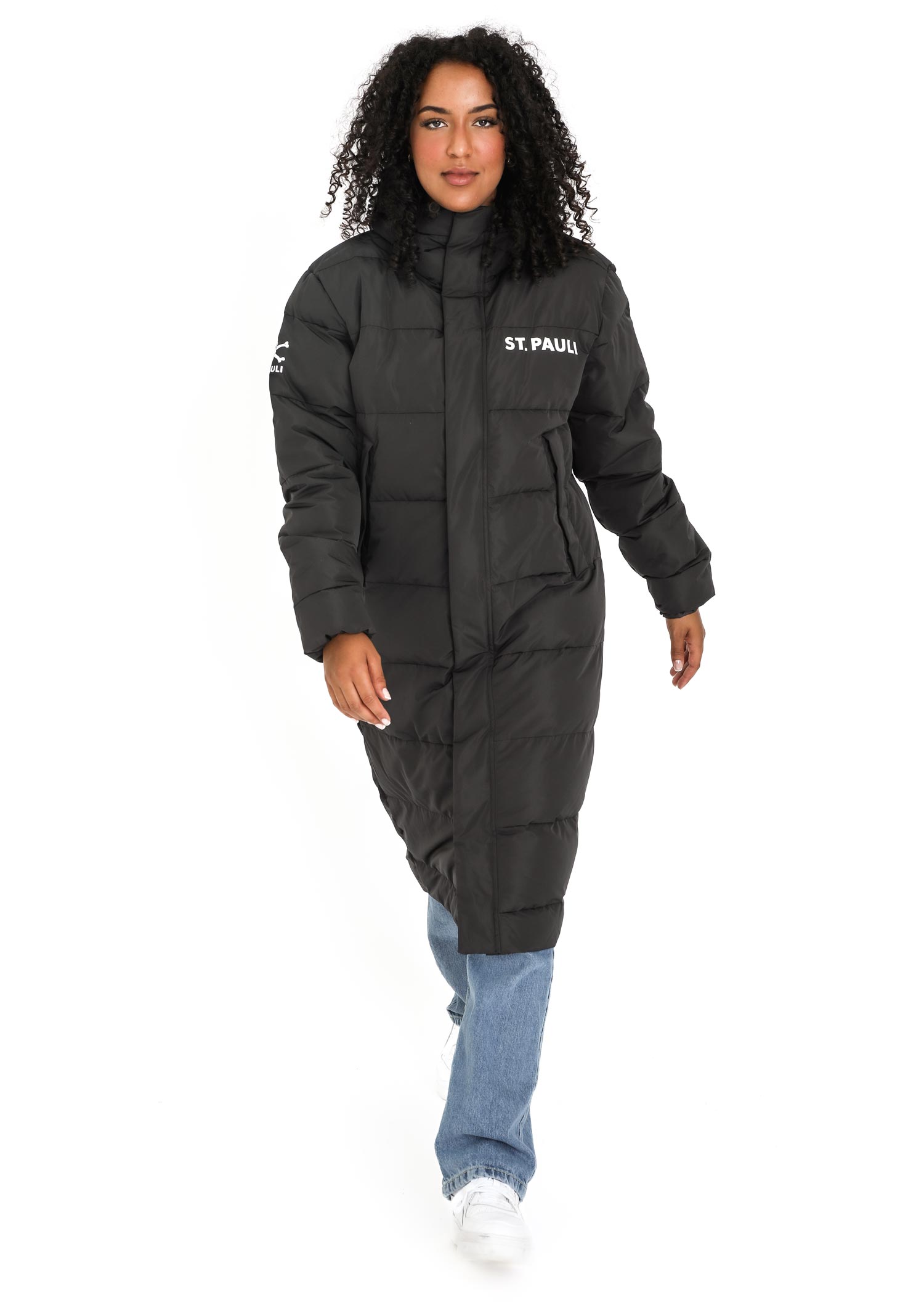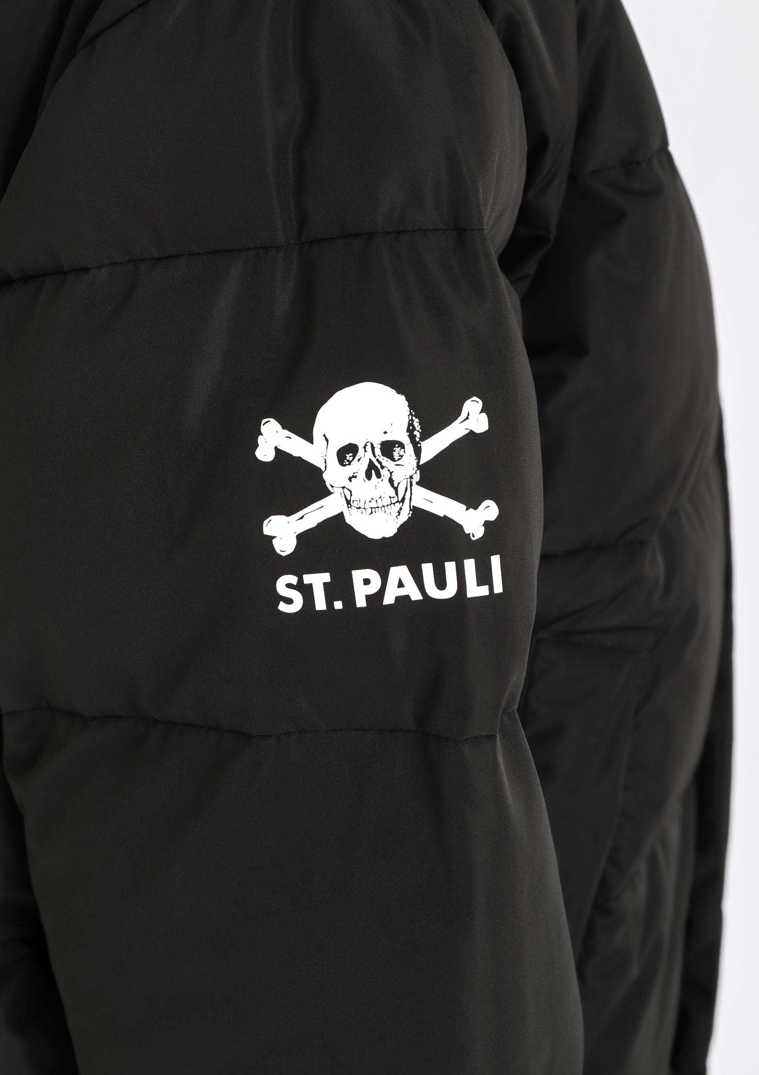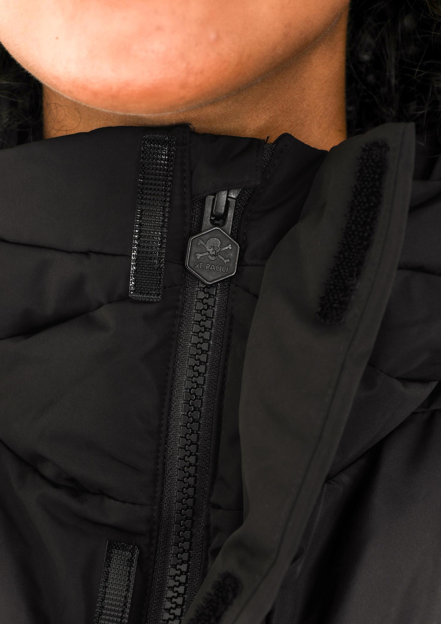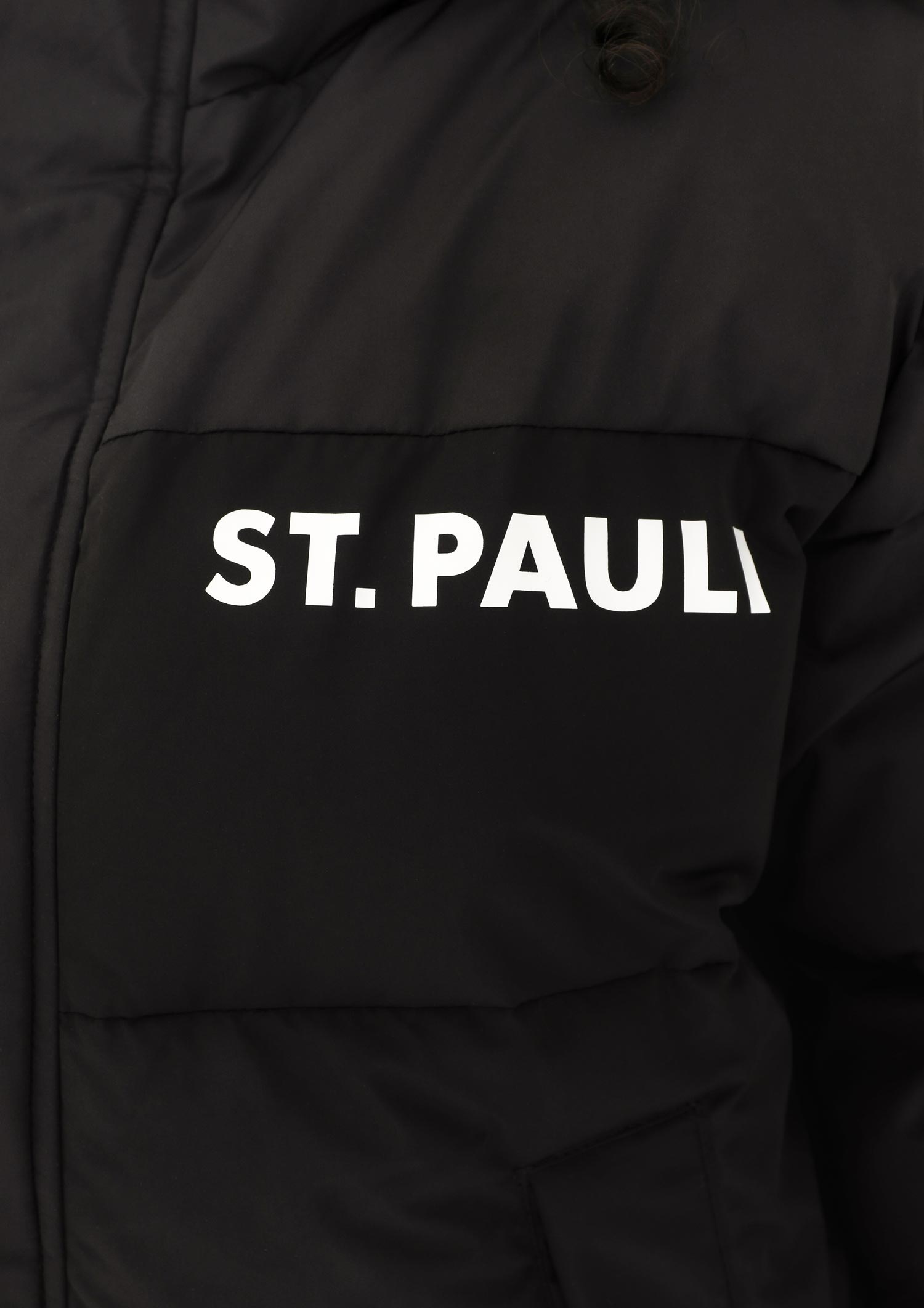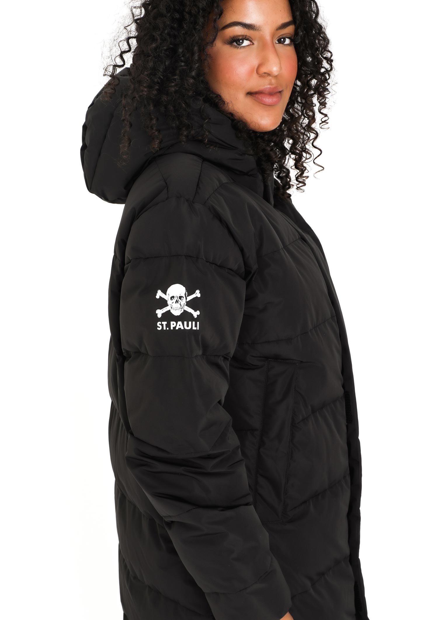 Unsere wadenlange, dick gefütterte Winterjacke mit ST. PAULI Schriftzug auf der Brust und Totenkopflogo auf dem Arm schützt dich zuverlässig vor Kälte, Nieselregen, Wind und allen weiteren Hamburger Wetterspezialitäten. Die große Kapuze, elastische Ärmelabschlüsse und ein verdeckter Zwei-Wege-Reißverschluss mit schützendem Stoffteil am Kinn machen Schietwetter so komfortabel wie möglich. In den großen, gefütterten Seitentaschen mit Druckknöpfen sowie in der versteckten Napoleon-Tasche ist Platz für Beanie, Handschuhe und vieles mehr. Die Unisex Winterjacke ist wasserabweisend und winddicht, besteht zu 100% aus recyceltem Polyester und das Hauptmaterial ist GRS-zertifiziert.