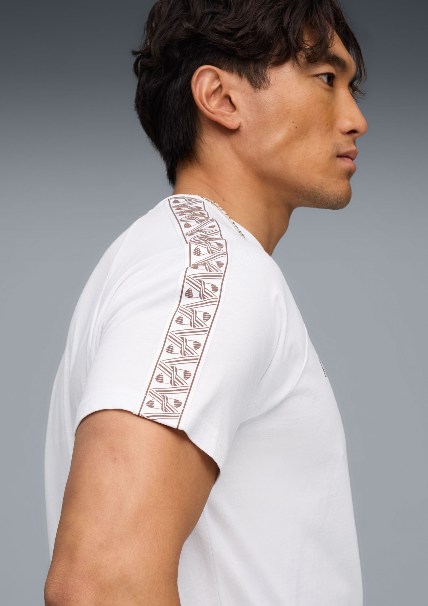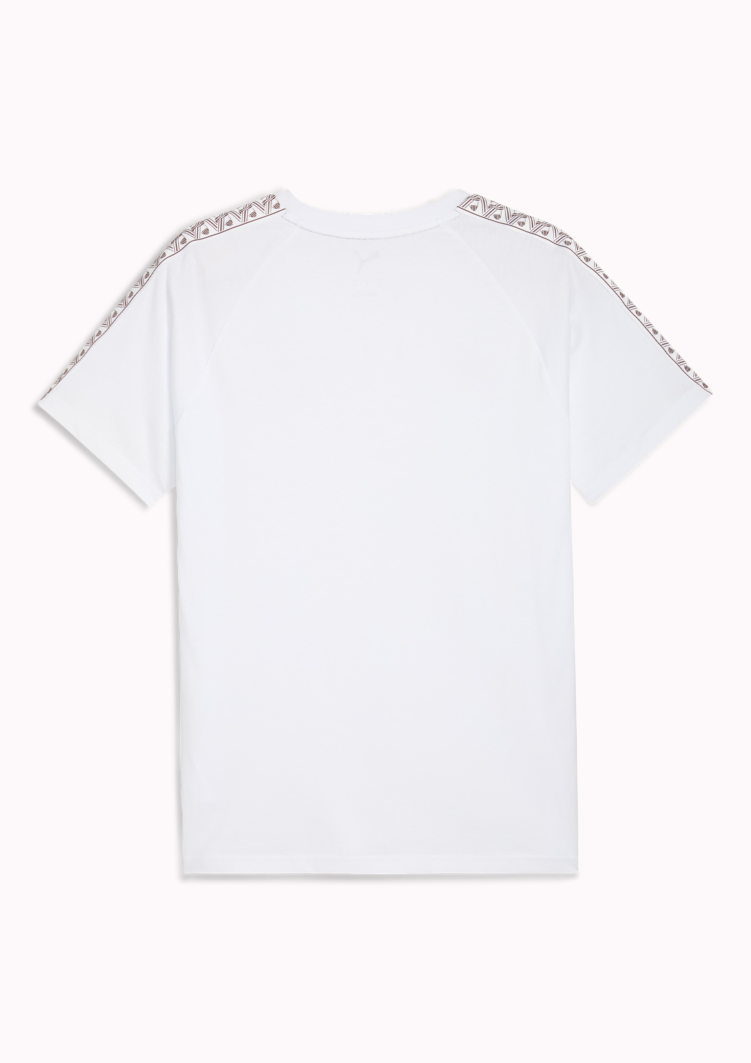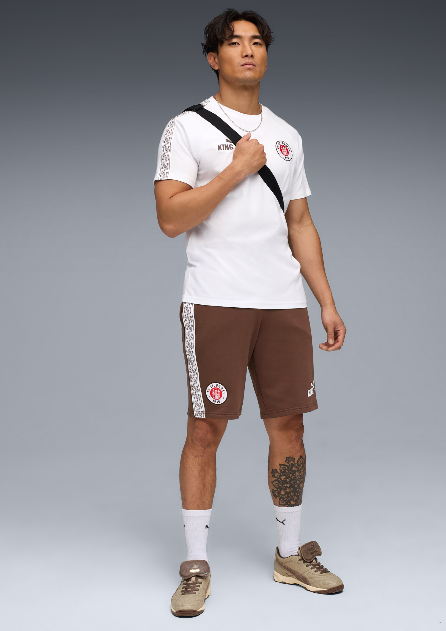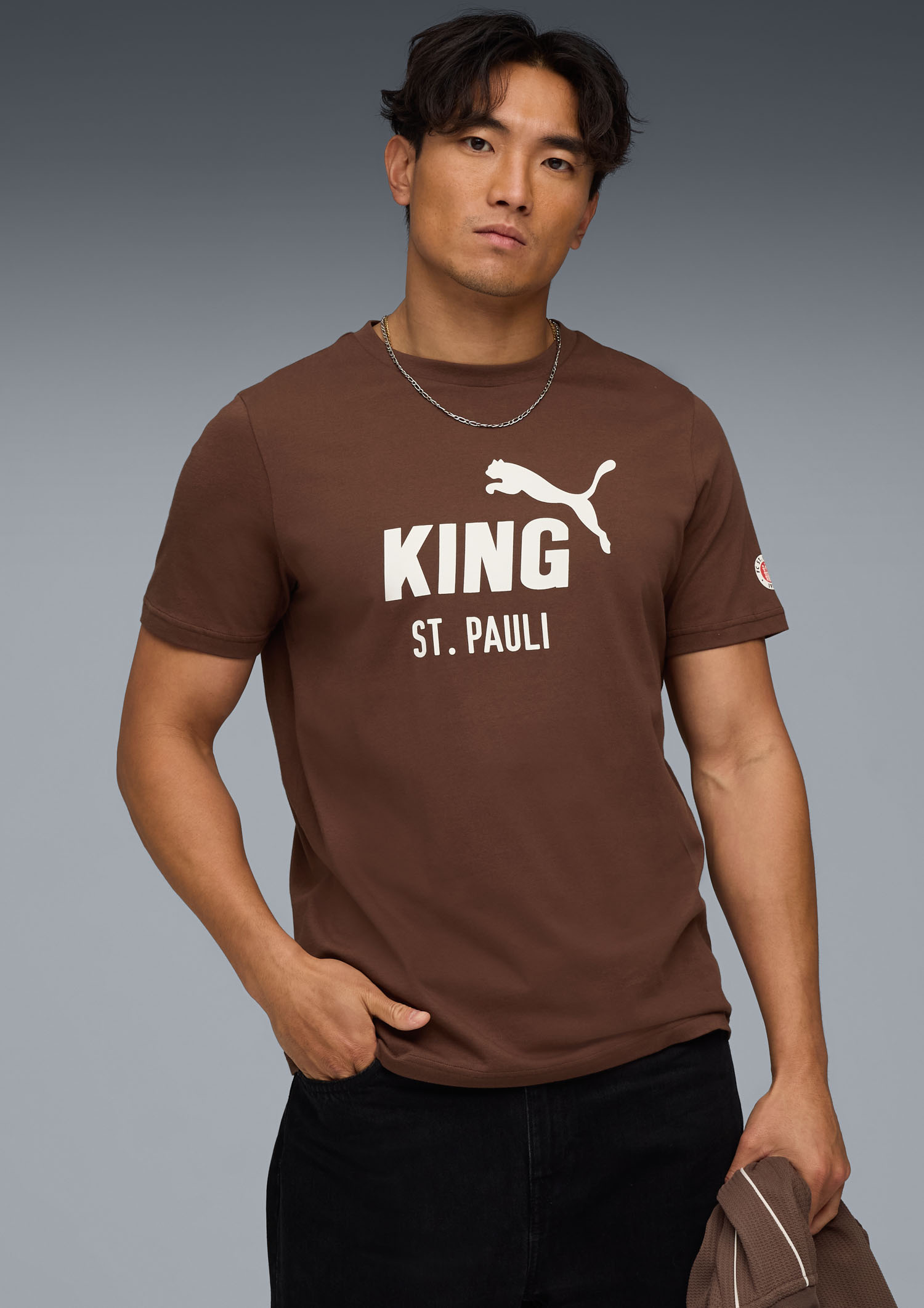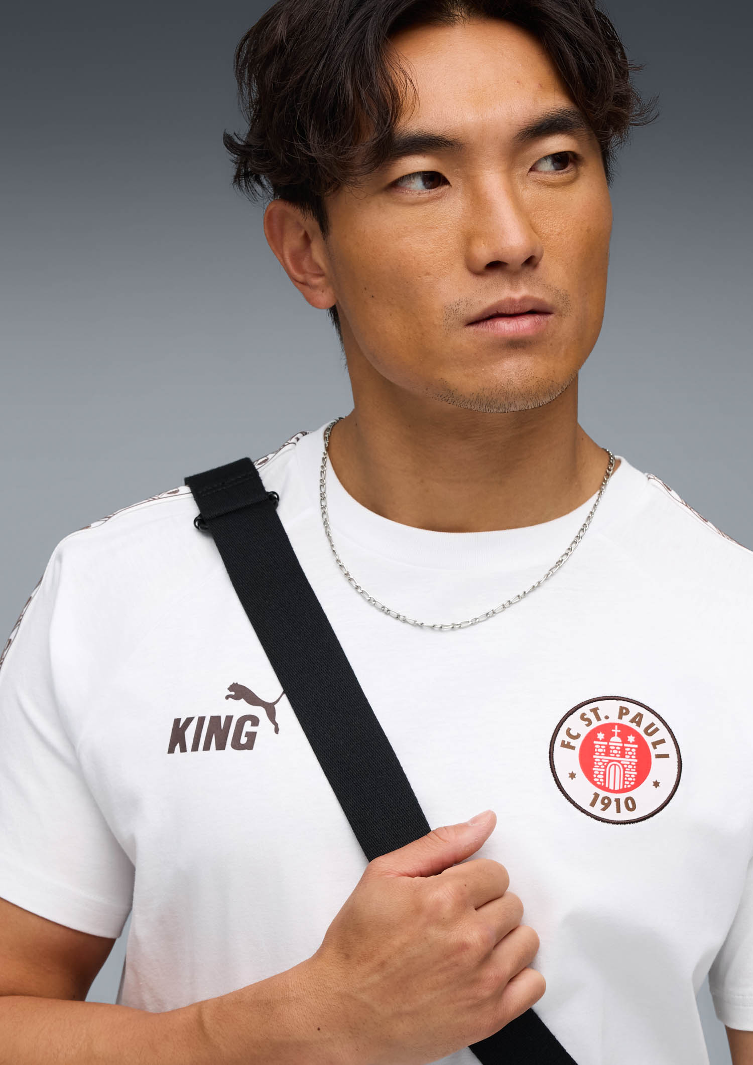 Weiß, klar, retro: Das PUMA x FC St. Pauli "KING" T-Shirt vereint den Geist der PUMA King Reihe mit modernem Kiez-Style. Mit dezentem KING-Print auf der Brust, dem PUMA Logo daneben und dem St. Pauli Wappen auf der anderen Seite zeigst du Haltung – ohne großes Tamtam. Das Highlight: Retro-inspiriertes Schulter-Tape mit Musterdetails im Stil alter Fußballtage. 100% Biobaumwolle für nachhaltigen Tragekomfort. Für alle, die das Spiel und den Stadtteil ernst nehmen.
