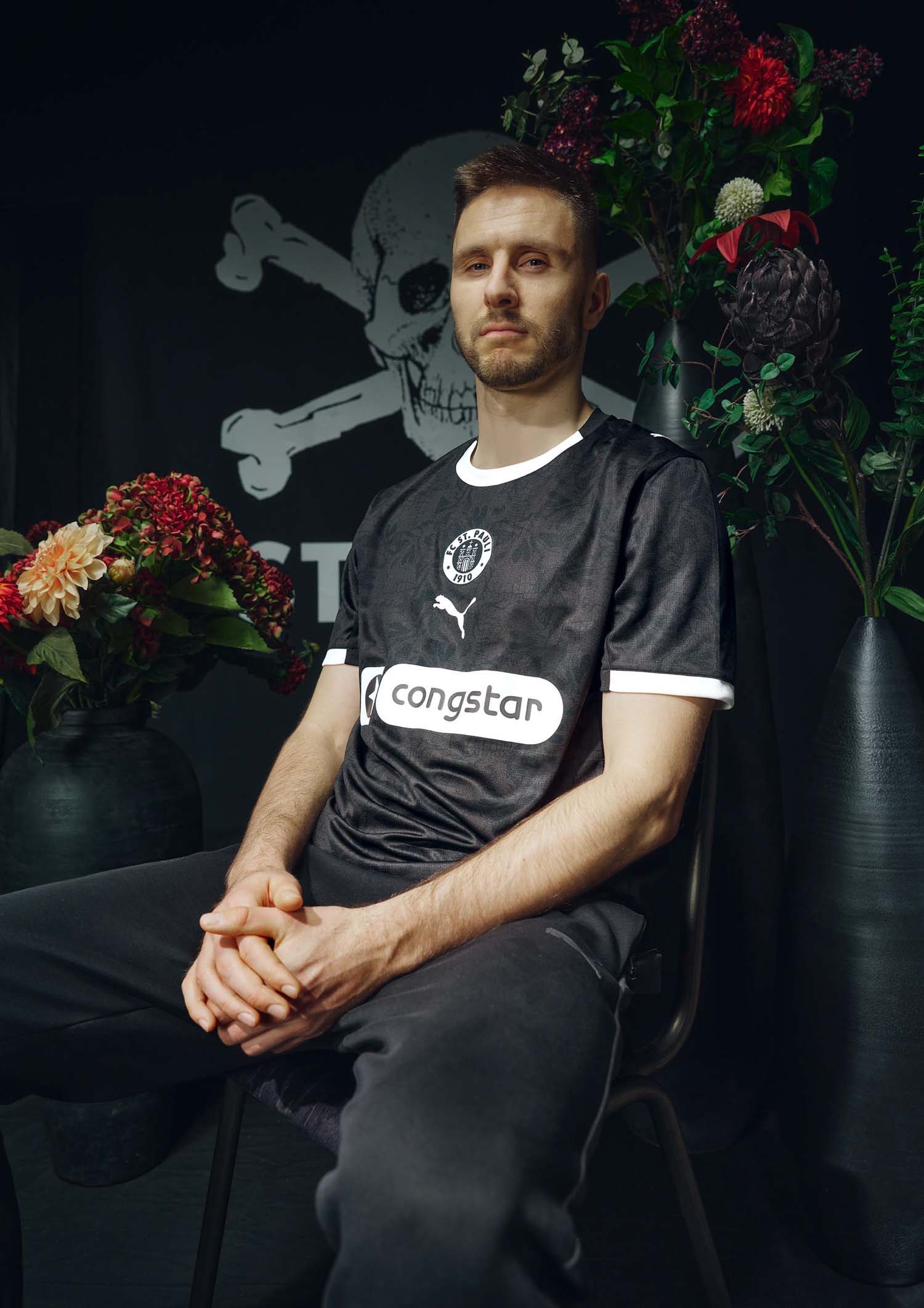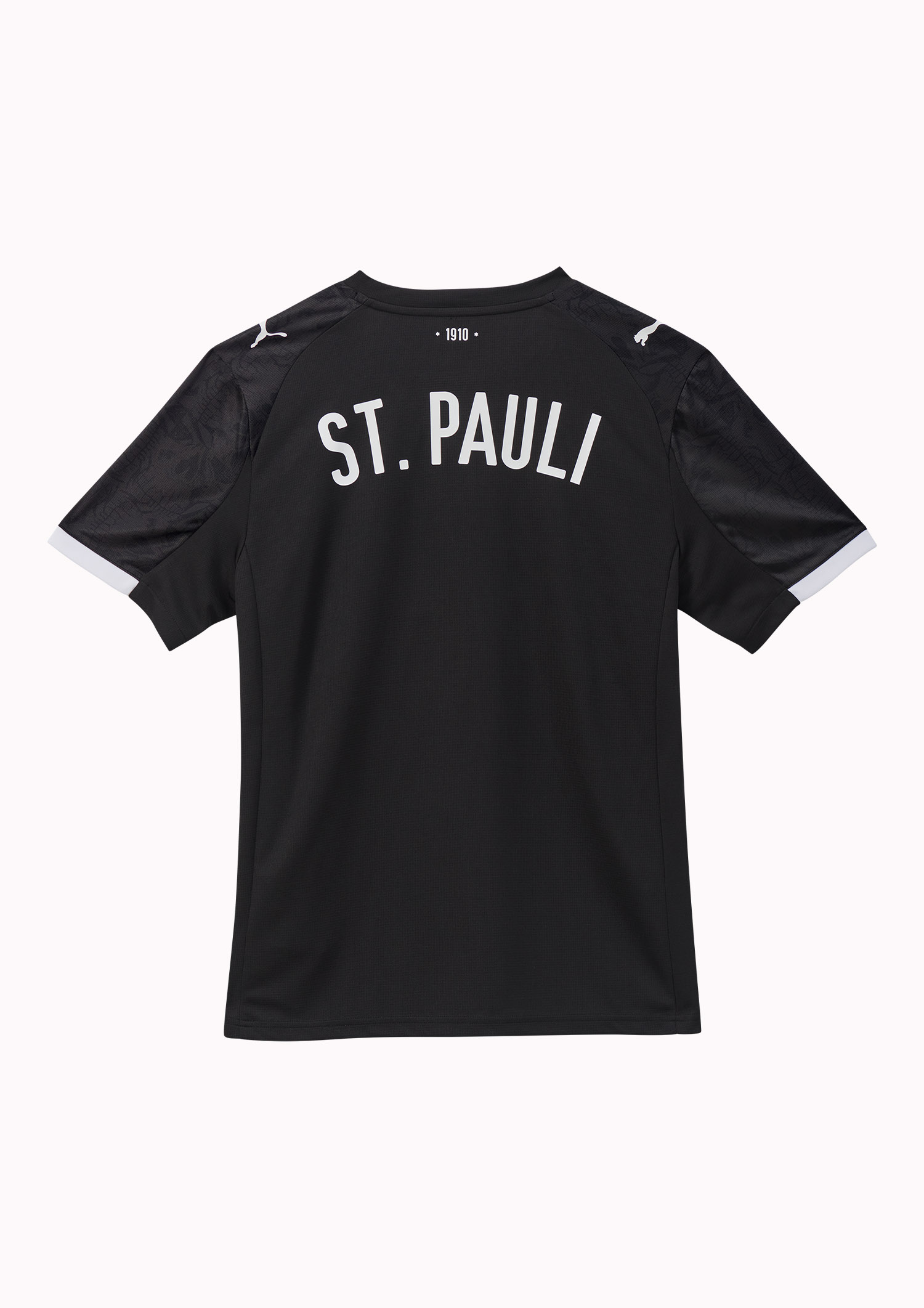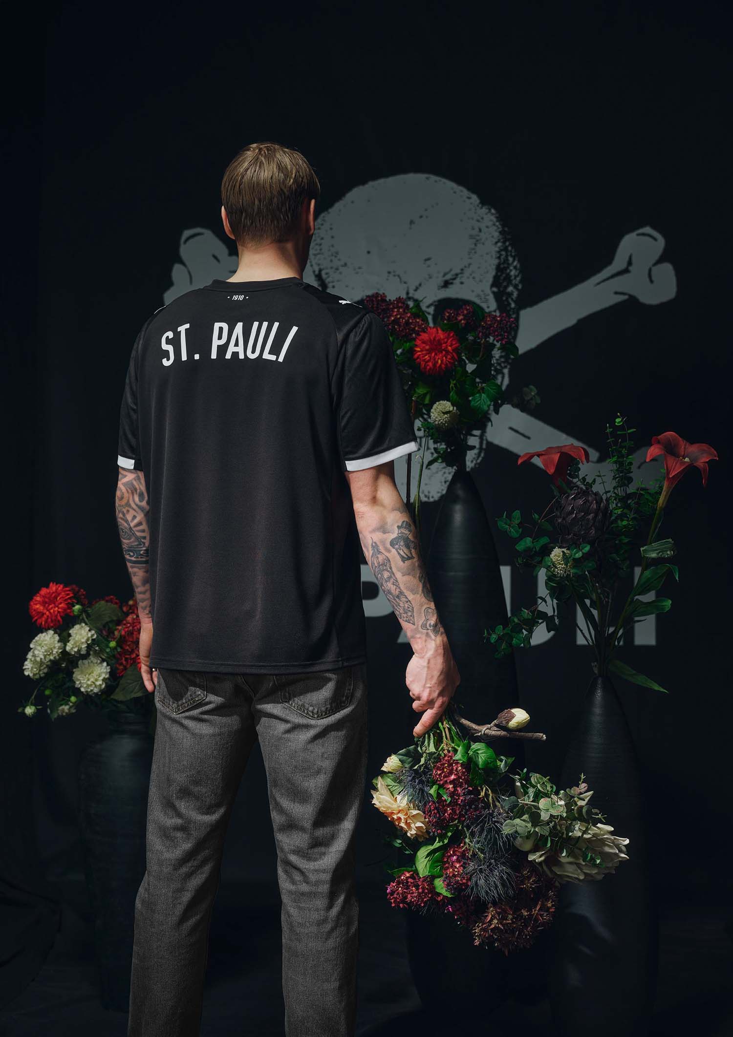 Das Trikot Drei des FC St. Pauli ist in Schwarz gehalten, mit dem Vereinswappen mittig auf der Brust und verewigt den wertegeladenen Totenkopf in den Details des Trikots.