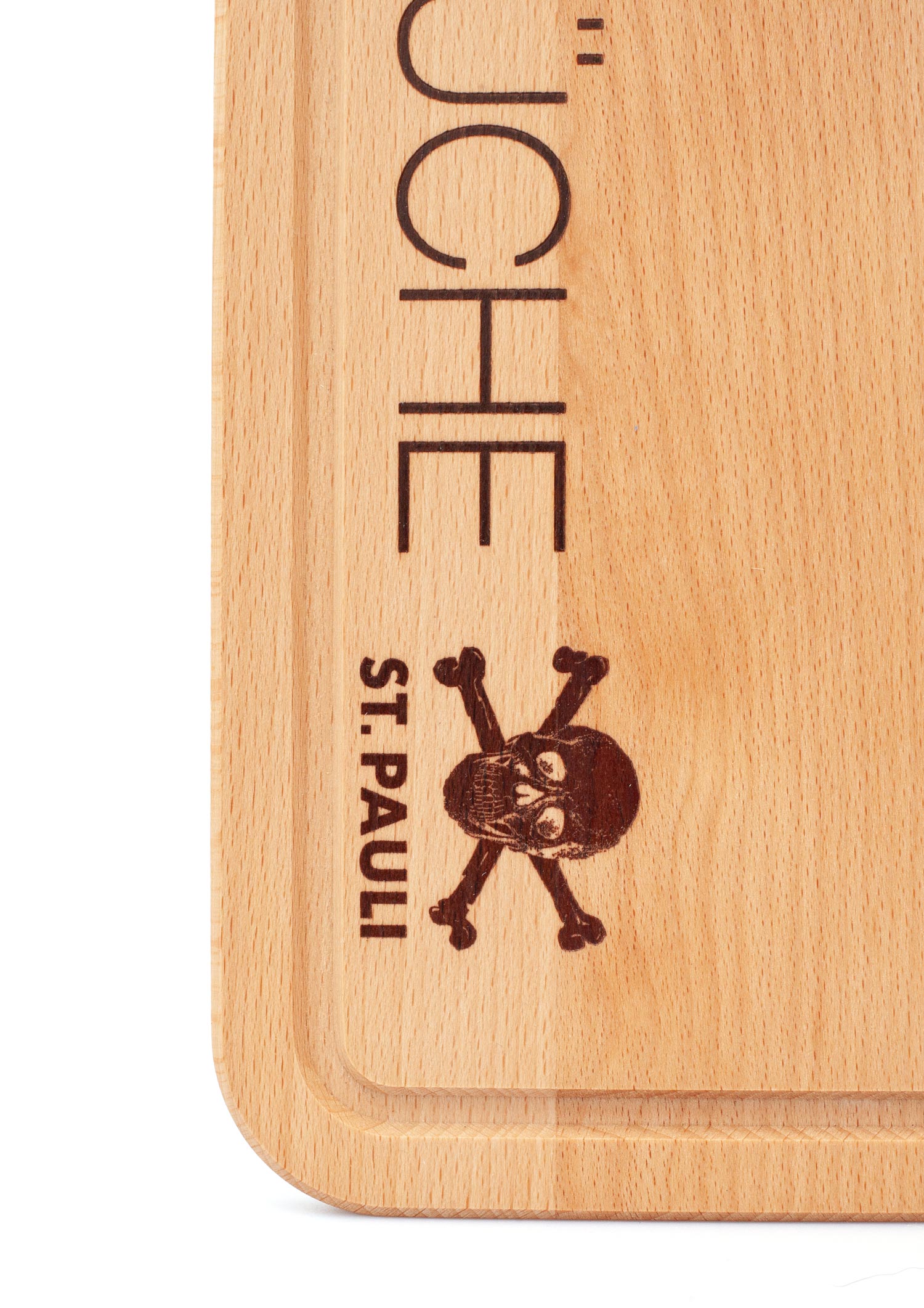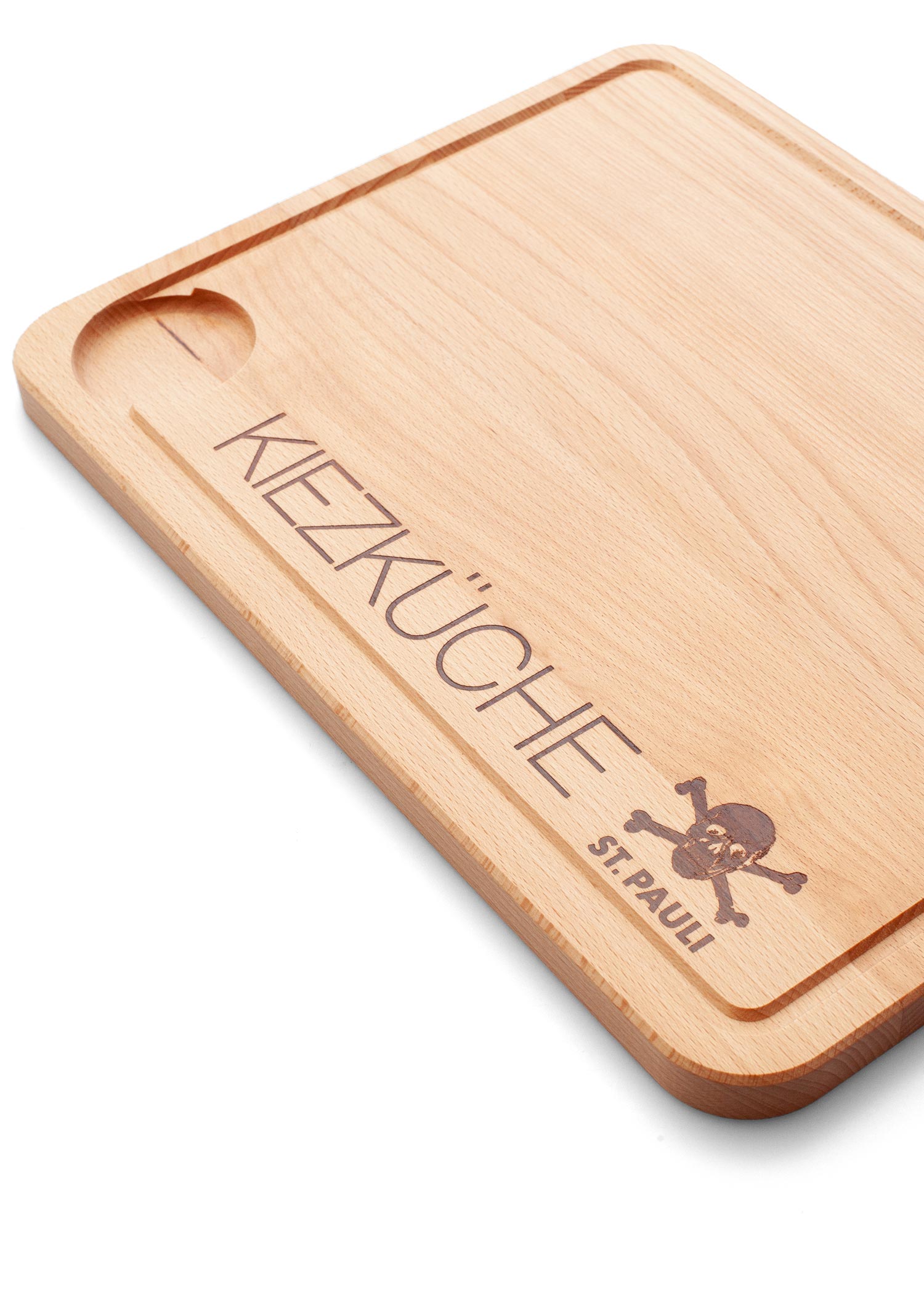 Auf der robusten Schneidefläche mit KIEZKÜCHE Schriftzug und Totenkopf Logo kannst du deine Lieblingszutaten schnibbeln und ansprechend servieren.