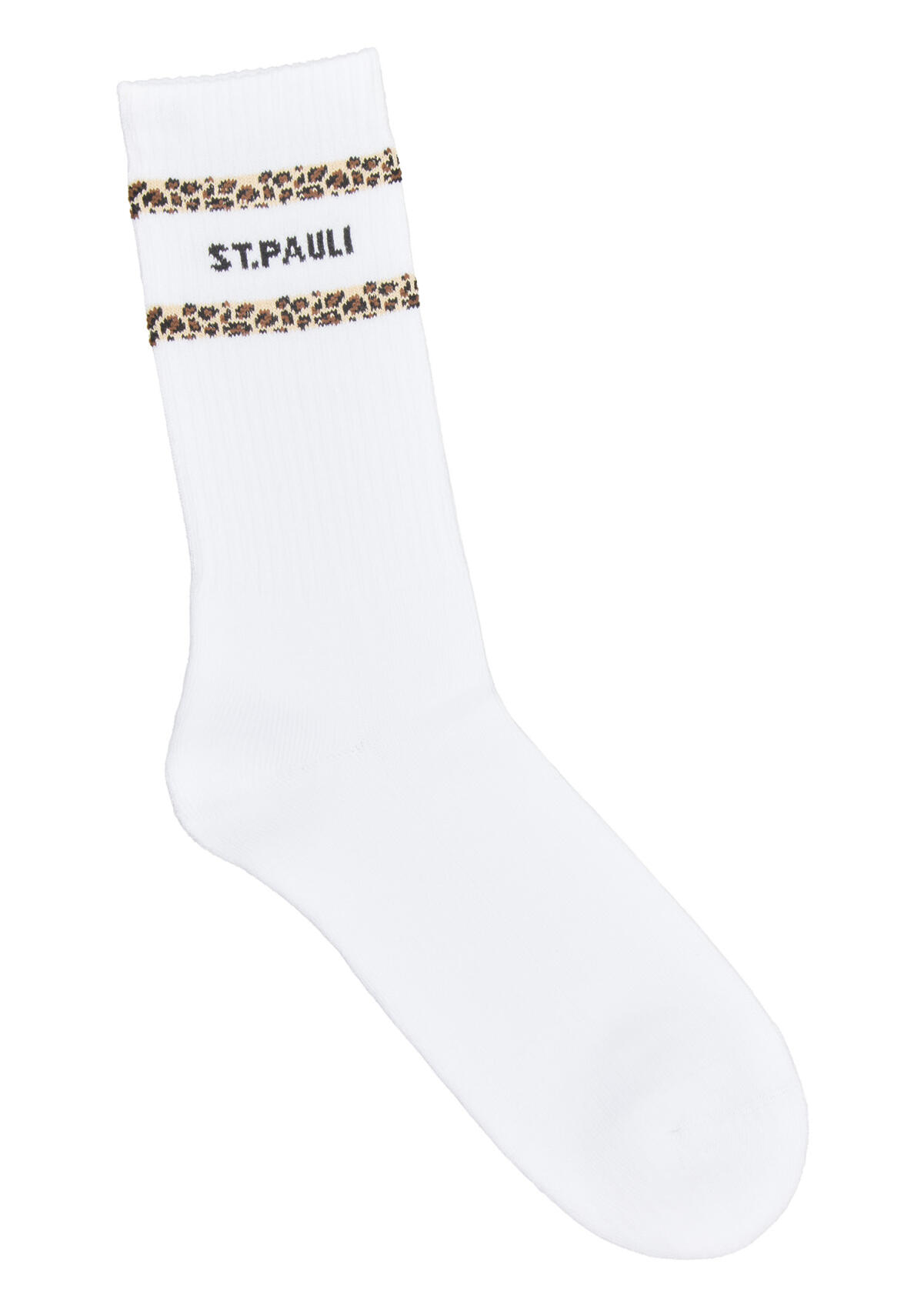 Klarer Look mit feinem Detail: Die Socken „Leo SANKT PAULI“ in Weiß setzen auf reduziertes Design und einen dezenten Leo-Streifen am Bündchen. Der Kontrast aus cleanem Weiß und dem schmalen Animal-Print sorgt für einen prägnanten Akzent, ohne laut zu werden. Der „ST. PAULI“-Schriftzug sitzt mittig und bringt die Verbindung auf den Punkt. Alltagstauglich, bequem und vielseitig kombinierbar – von Sneakern bis Boots.