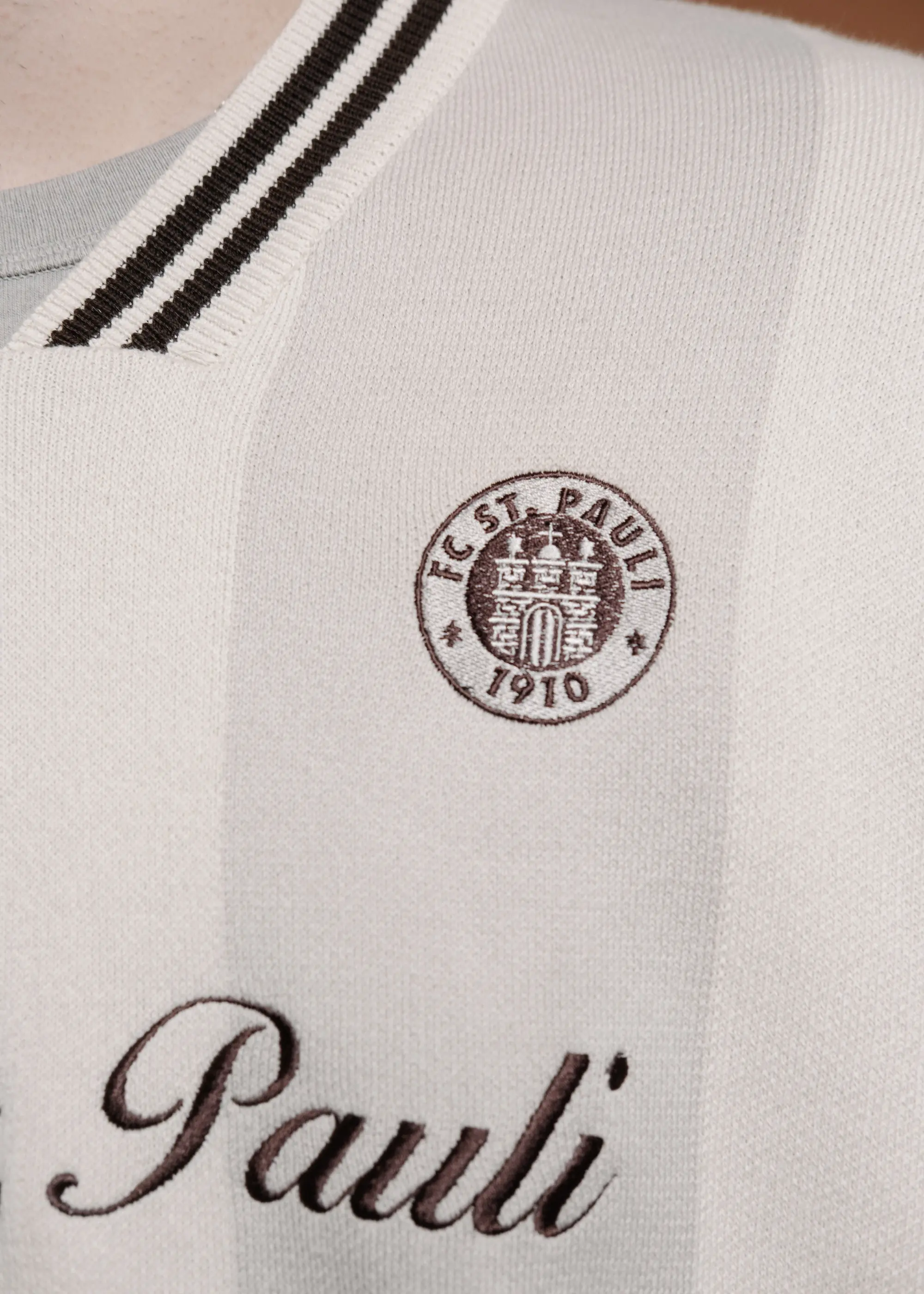 Oldschool trifft Hafenstraße: Der FC St. Pauli Strickpullover „Grand Dad“ bringt britische College-Vibes direkt in den Kiez. Mit Zopfmuster, V-Ausschnitt und kontrastierenden Streifen an Saum und Bündchen steht er für den klassisch-rebellischen Look der Boys in Brown. Auf der Brust sitzt das gestickte FC St. Pauli Logo dezent, aber klar sichtbar. Ob am Spieltag, in der Kneipe oder im Alltag – dieser Pullover ist für alle, die ihre Haltung nicht brüllen müssen. Stylisch, warm, 100 % FCSP.