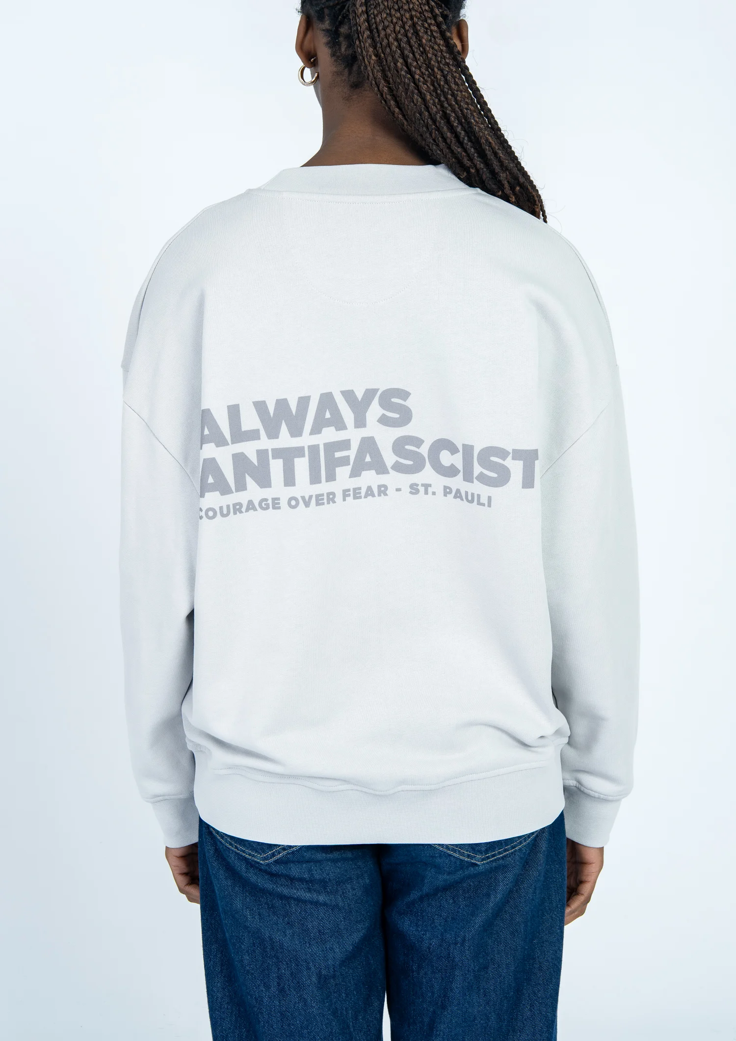 Klare Kante, cleaner Schnitt: Der FC St. Pauli Sweater „Always Antifascist“ bringt antifaschistische Haltung direkt auf den Rücken – mit fettem Statement-Print ALWAYS ANTIFASCIST und dem Zusatz Courage over Fear – St. Pauli. Vorn zeigt der graue Crewneck subtil, wo du herkommst: 20359 ST. PAULI HOOD. Mit seinem angesagten Boxy Fit und 100% schwerer Bio-Baumwolle sitzt der Sweater locker, aber sitzt – genau wie deine Haltung. Für alle, die es ernst meinen. Für alle, die St. Pauli leben.