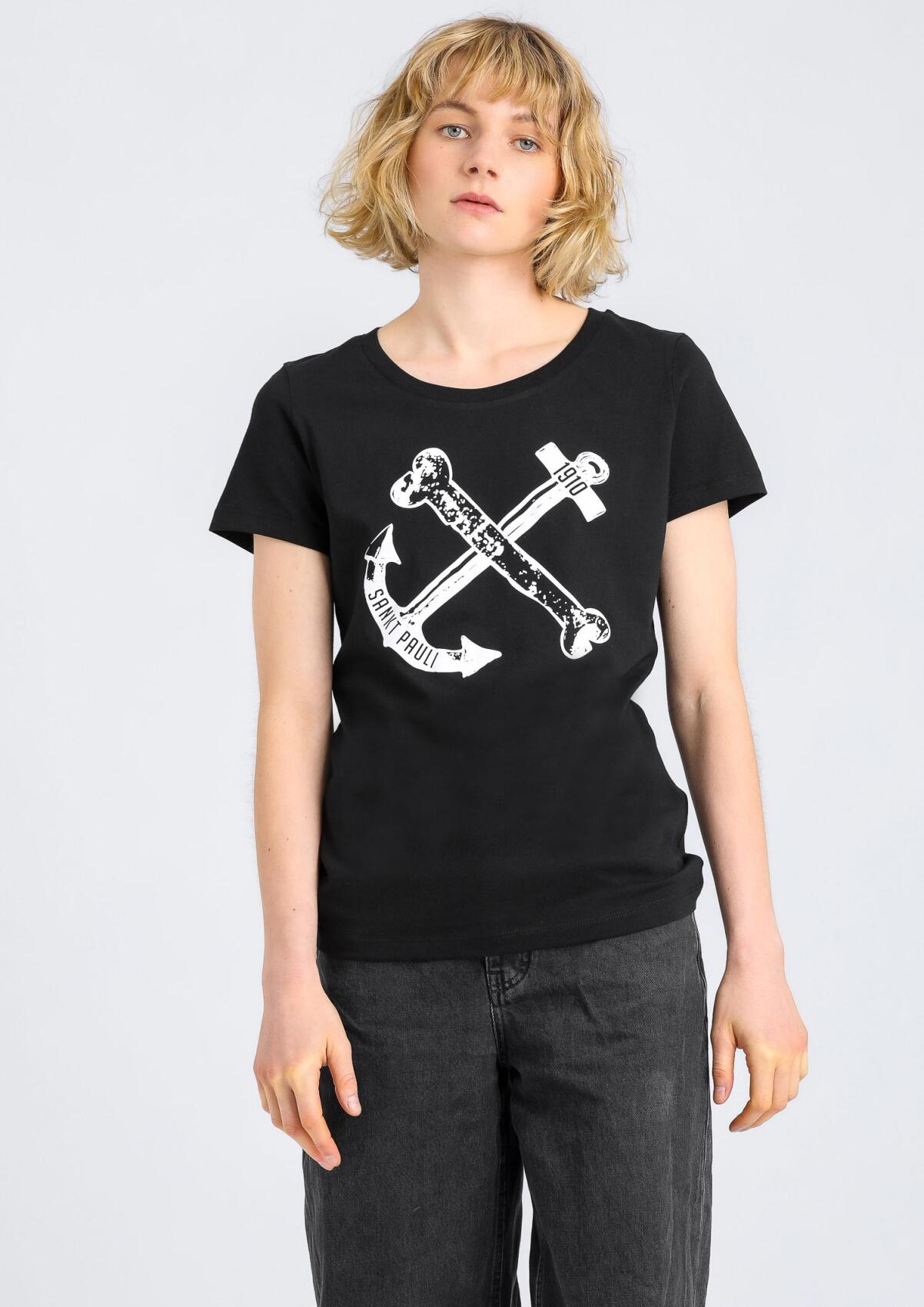 Maritim und rebellisch – das Frauen T-Shirt "Anker" in Schwarz bringt den Hafencharme St. Paulis direkt in deinen Kleiderschrank. Der große, kontrastreiche Anker-Print mit "St. Pauli 1910"-Schriftzug verleiht dem Shirt seinen einzigartigen Look. Dank der taillierten Passform und des weichen Baumwollmaterials sitzt es perfekt und sorgt für maximalen Tragekomfort. Ein Must-Have für alle St. Pauli-Fans, die ihre Liebe zum Kiez und zur See mit Stil zeigen möchten.