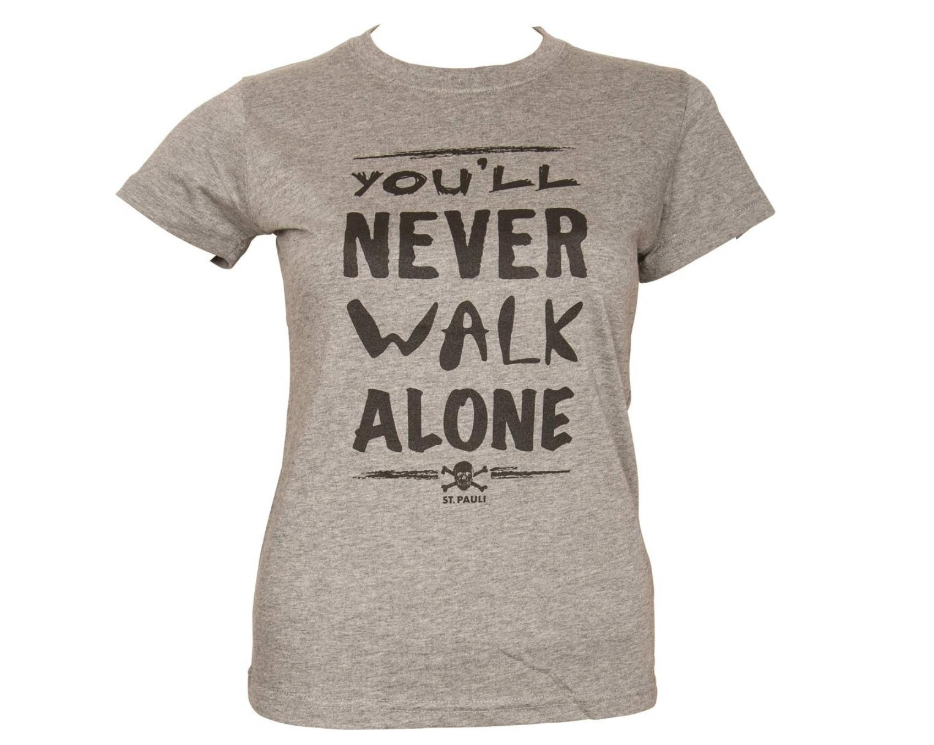 Zeig deine Verbundenheit mit dem FC St. Pauli mit dem Frauen T-Shirt "You'll Never Walk Alone". Der kraftvolle Schriftzug in Schwarz hebt sich markant vom grauen Hintergrund ab und wird durch den kleinen Totenkopf-Print darunter abgerundet. Mit seinem figurbetonten Schnitt und dem weichen Material vereint es Style und Tragekomfort. Ein Statement für Zusammenhalt und Teamgeist – ideal für jeden Anlass, ob im Stadion oder auf der Straße.