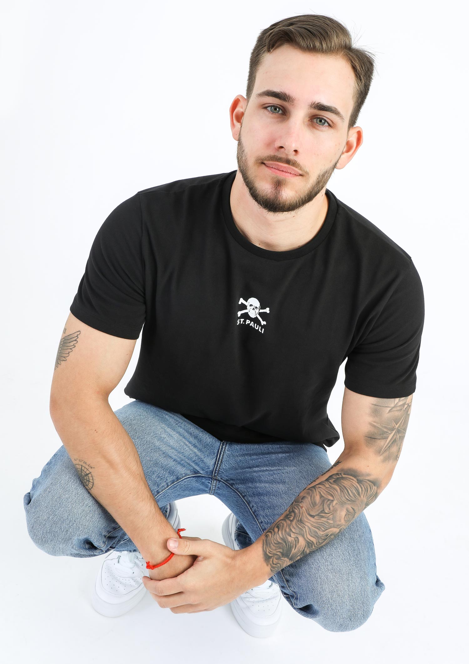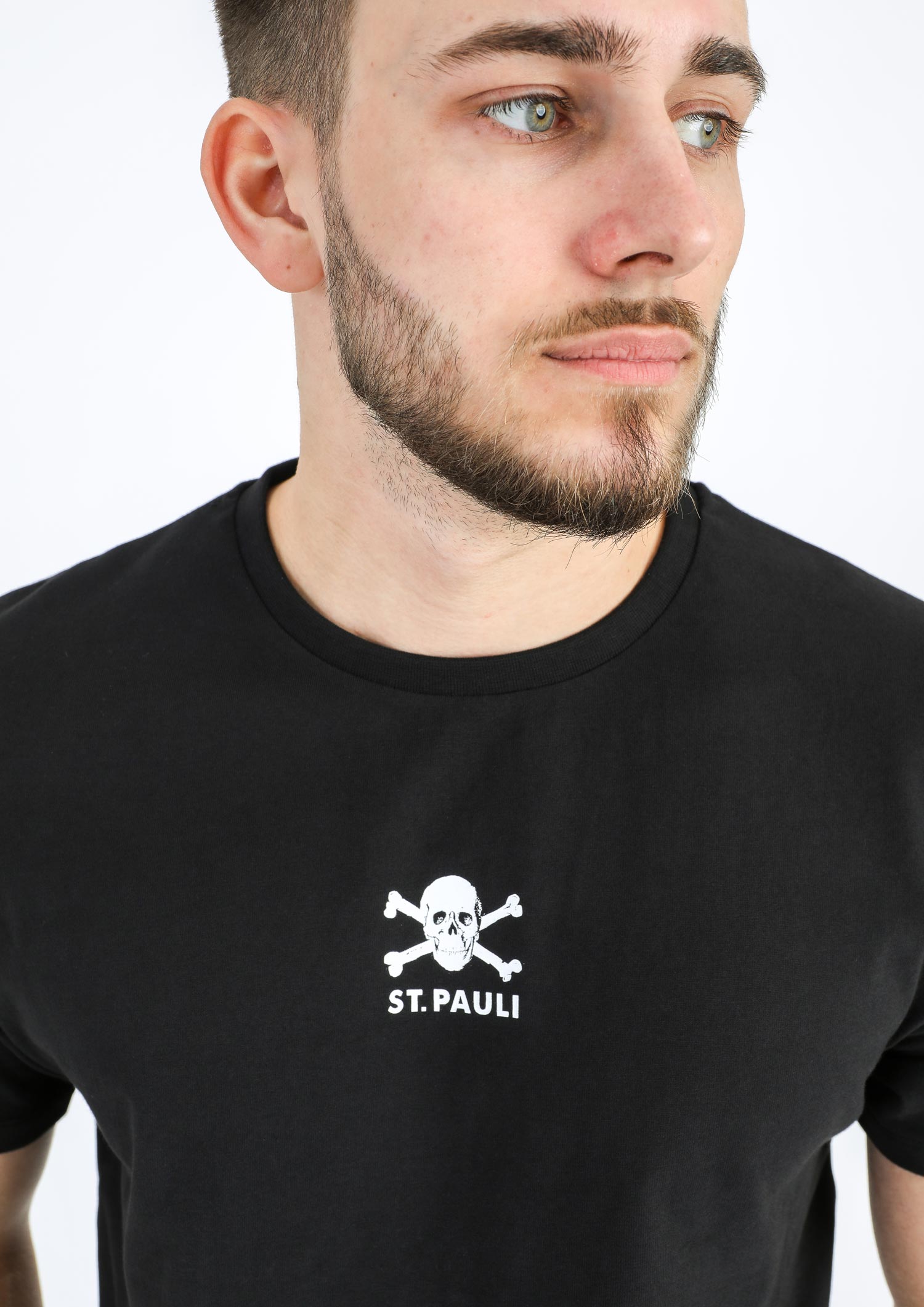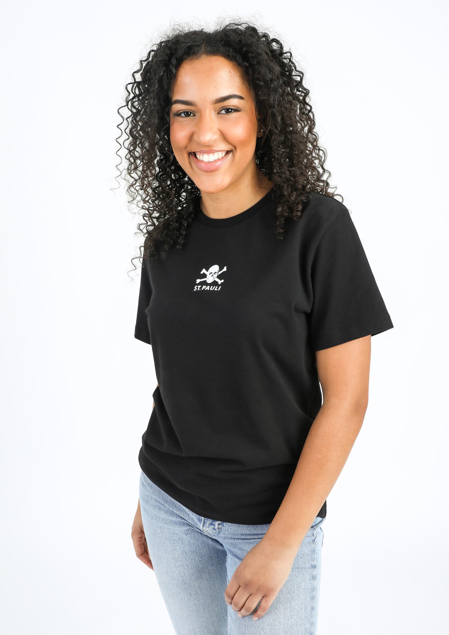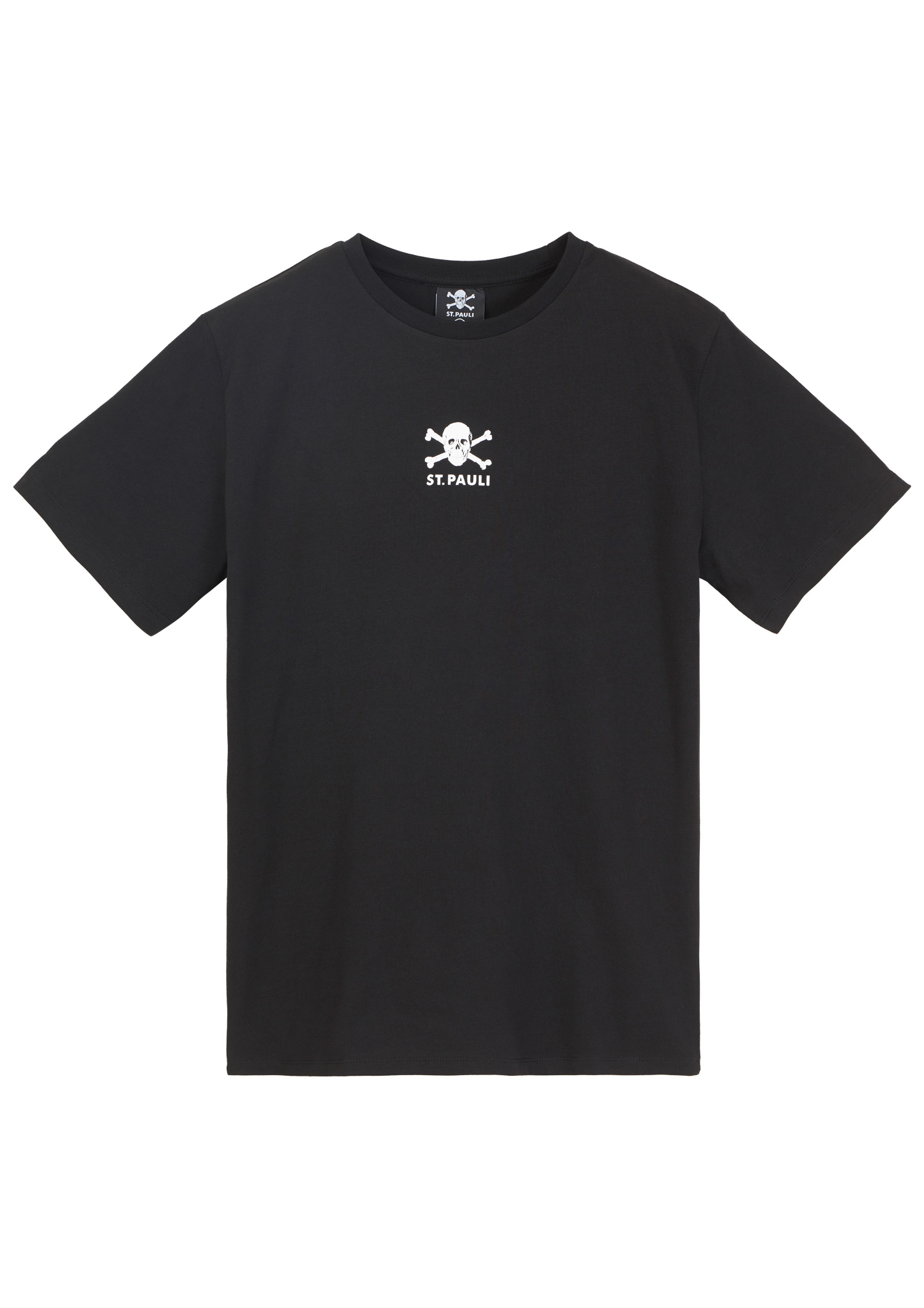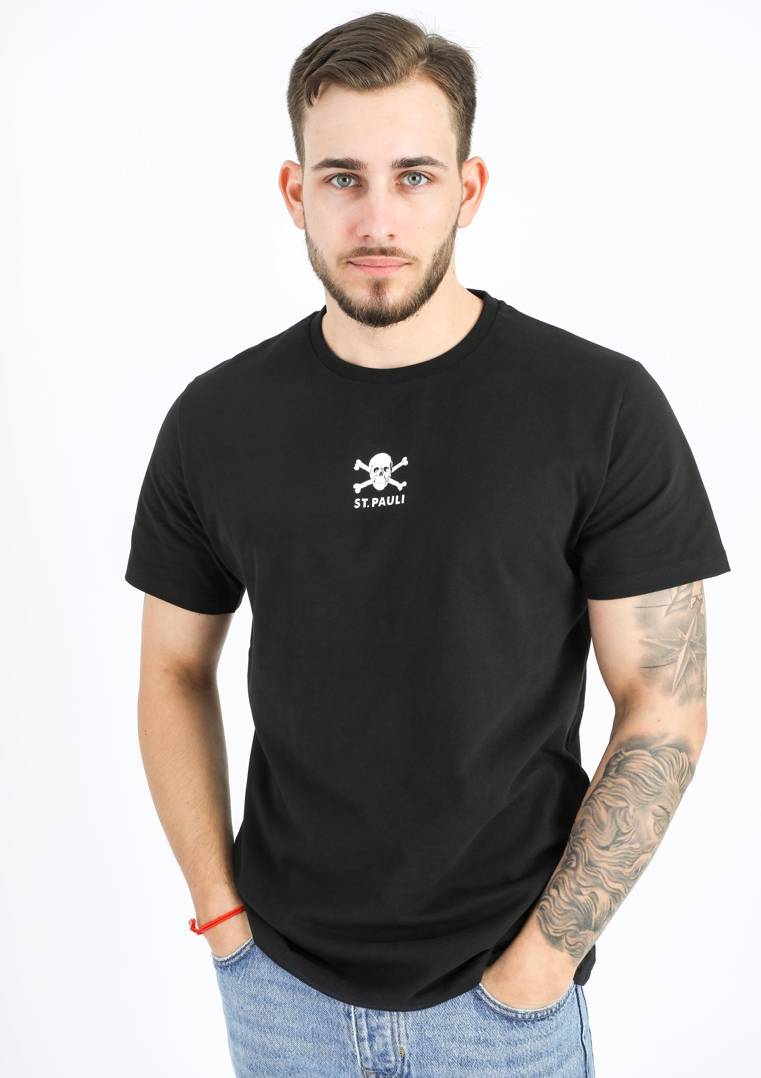Klassisches, schwarzes T-Shirt mit kleinem, weißem Totenkopflogo mittig auf der Brust. Das T-Shirt besteht zu 100% aus hochwertiger Bio-Baumwolle.