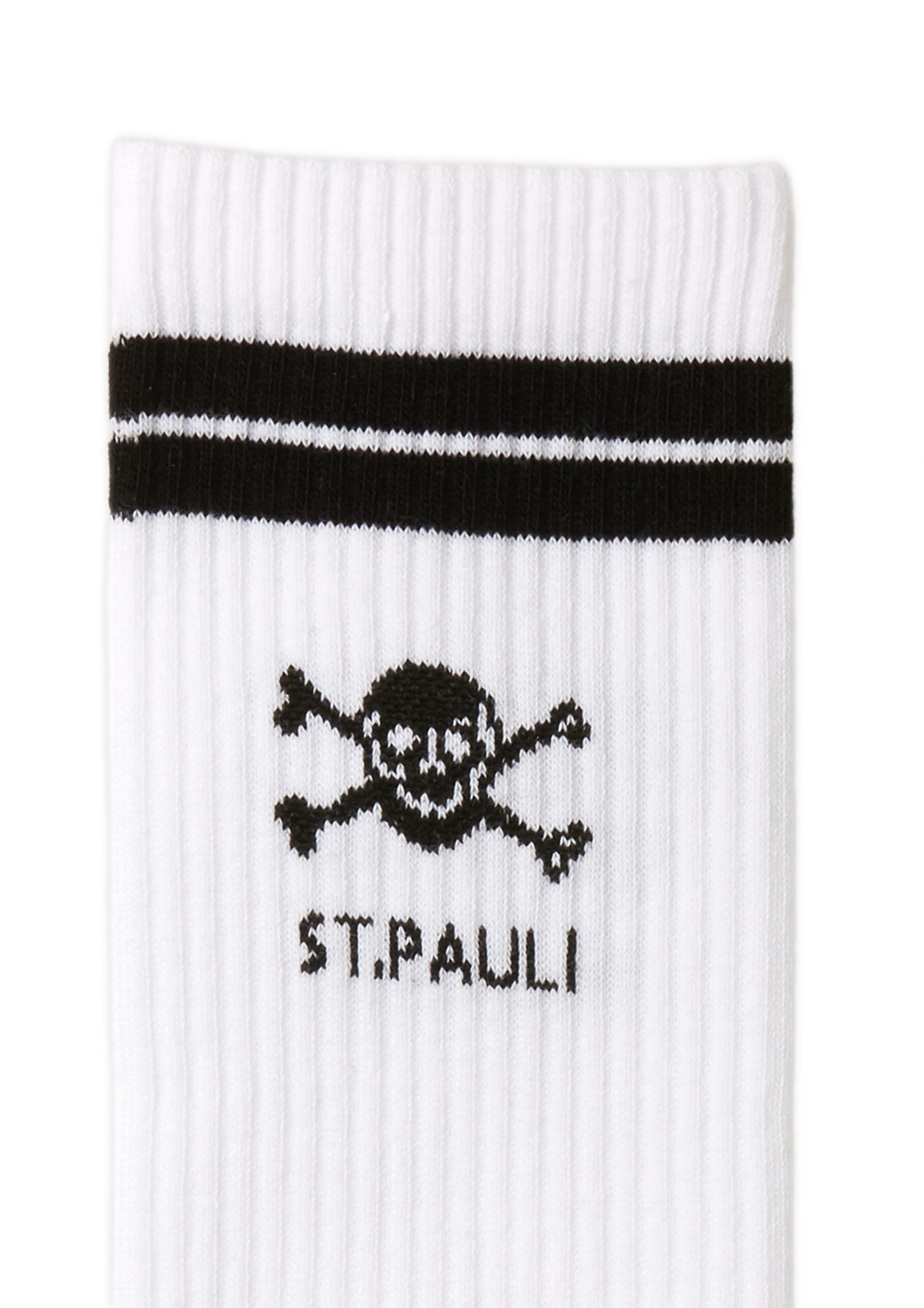 Mit den Tennissocken "Totenkopf" zeigst du deinen St. Pauli Style von Kopf bis Fuß. Die weißen Socken mit schwarzen Kontrastelementen und eingestricktem Totenkopf-Logo bringen Komfort und Statement zusammen. Perfekt für Sport oderAlltag – immer ein Zeichen für den Kiez!