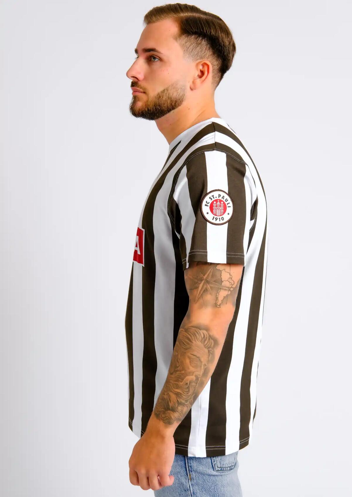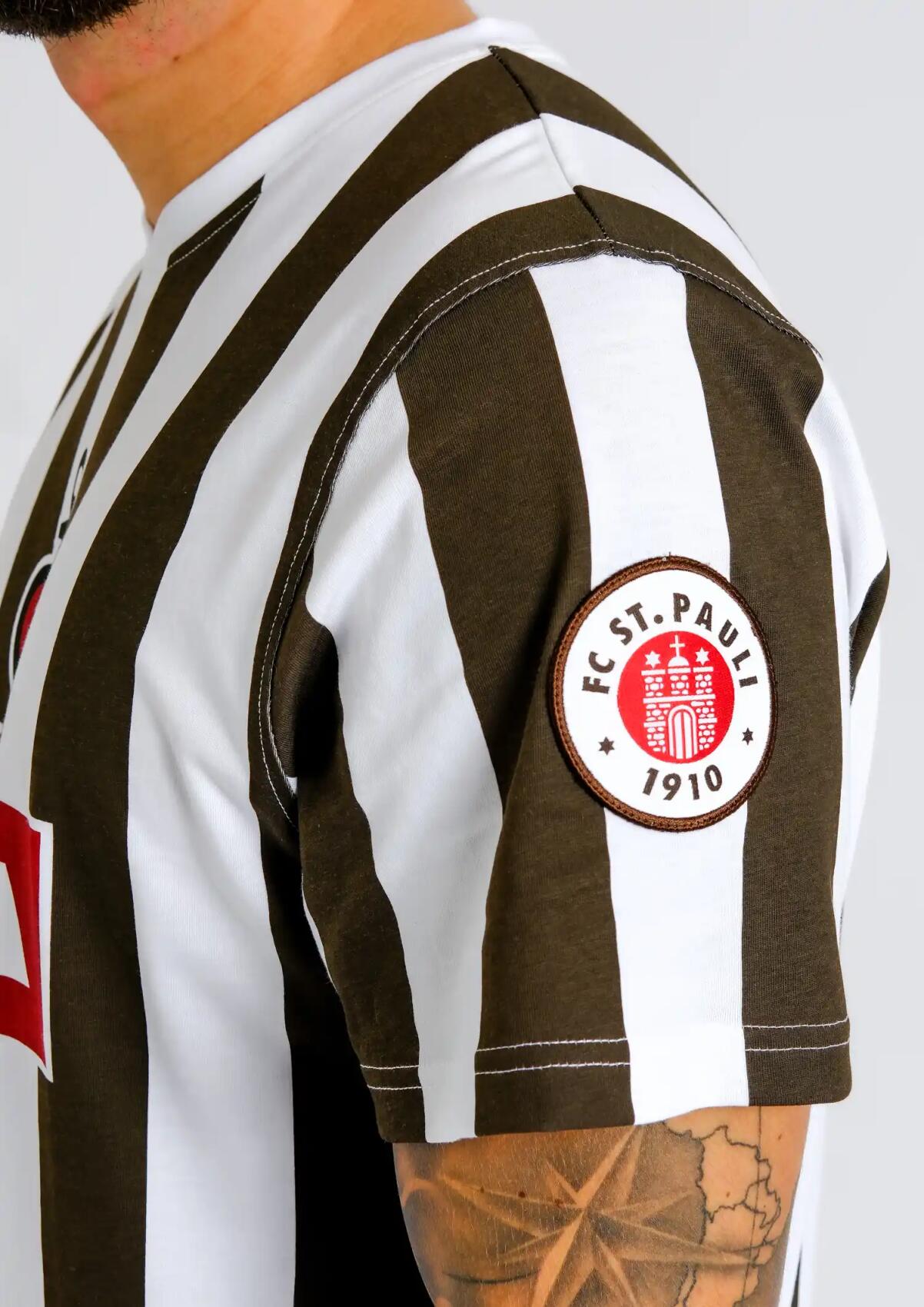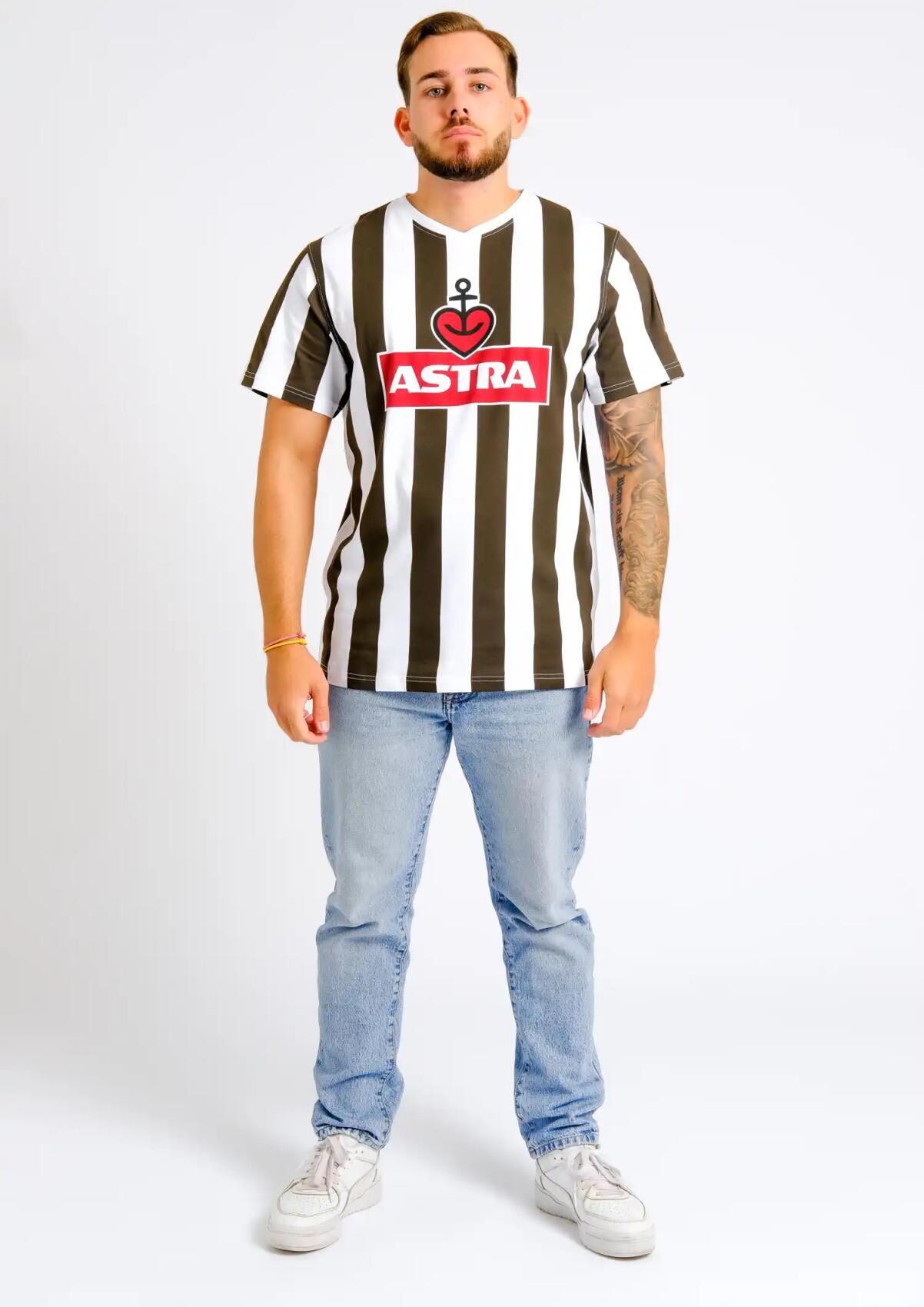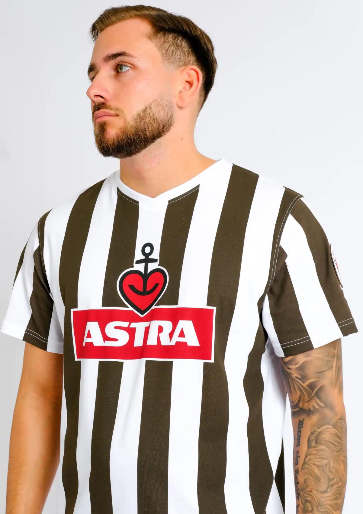 Nach 15 Jahren nun auch schon als Klassiker zu bezeichnen. Es waren nur 2 Monate, aber immerhin, einmal war der Wunschsponsor Astra dann doch auf der Brust. T-Shirt Remake des Aufstiegstrikots von 2001 aus Baumwolle. Sponsor im Siebdruck, Vereinslogo auf dem Arm gestickt. T-Shirt mit V-Ausschnitt und gedruckten Streifen.
