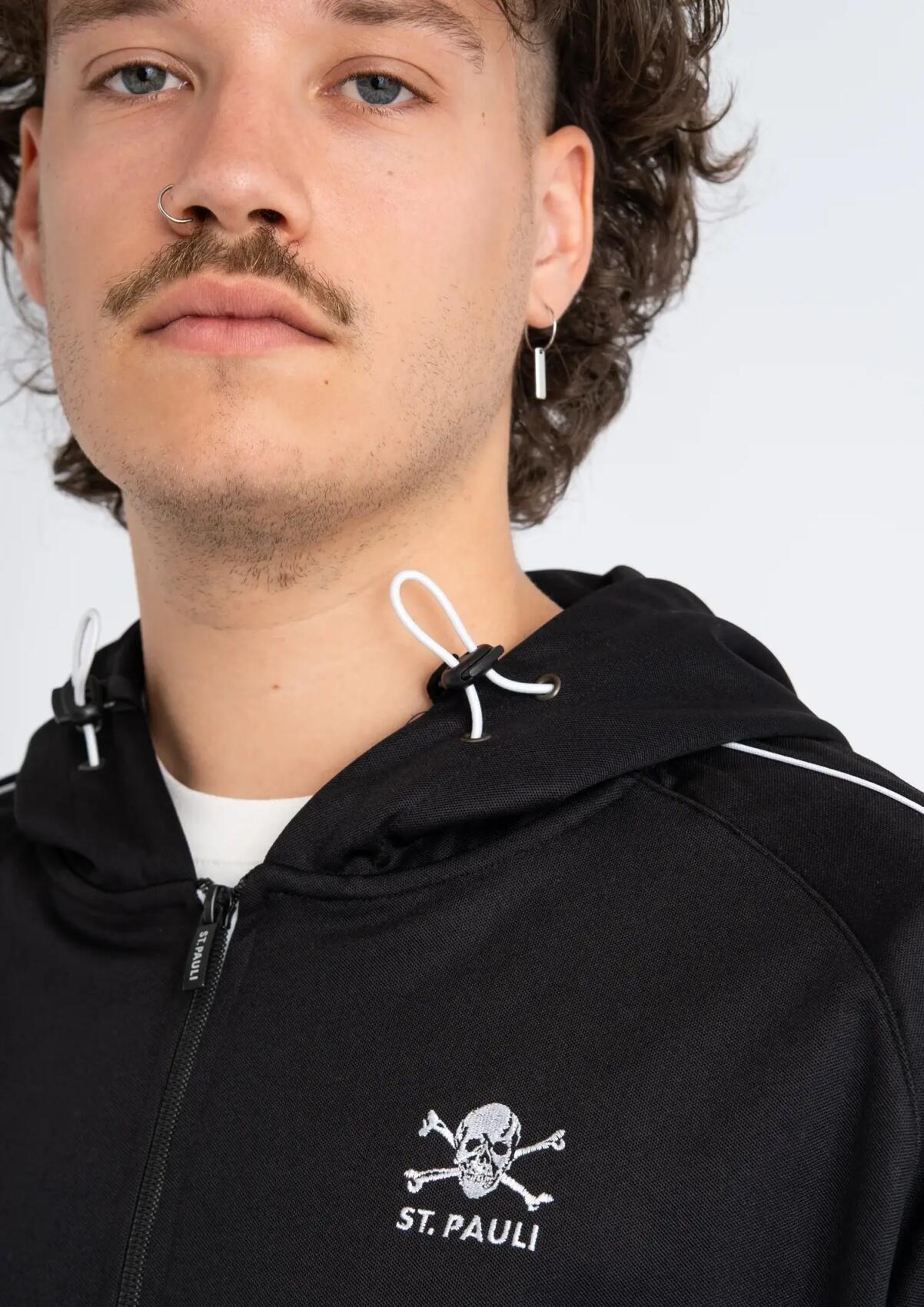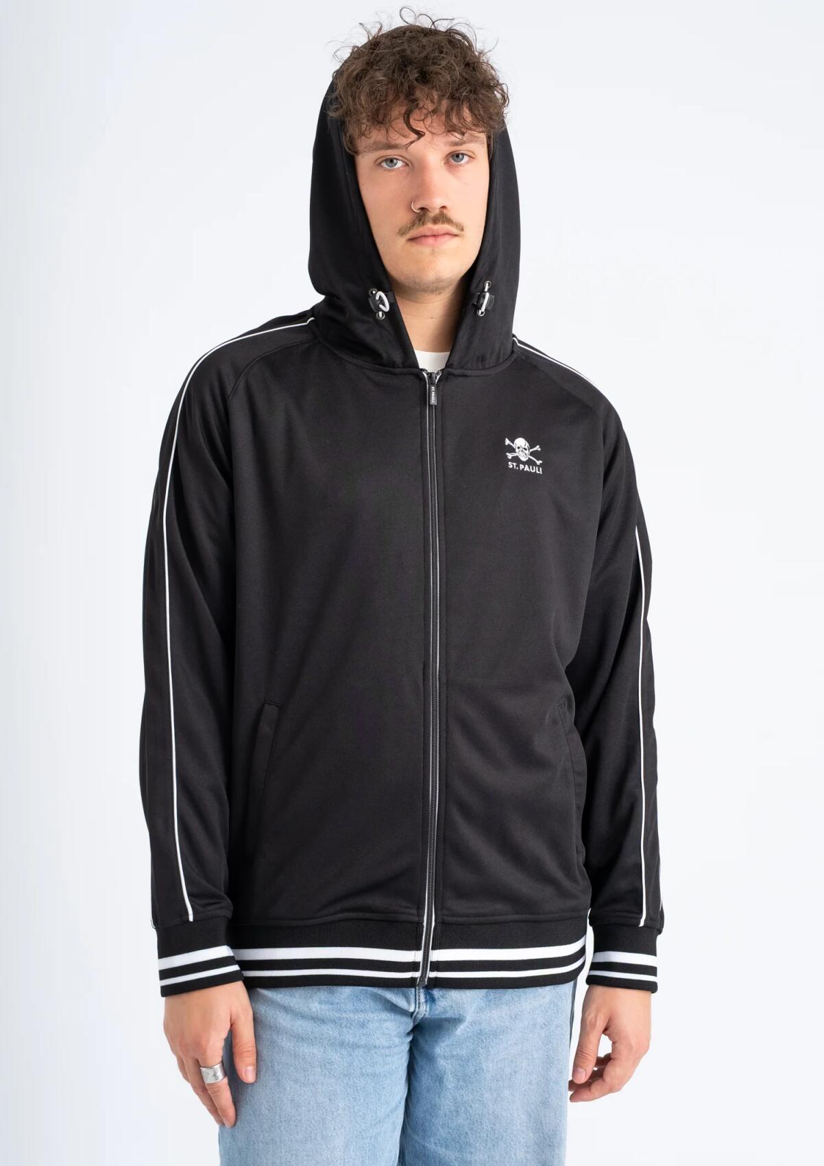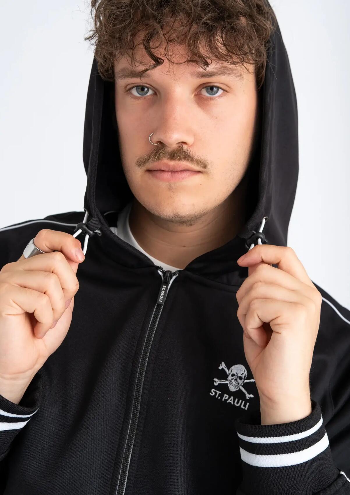 Schwarz. Totenkopf. Ansage. Die Trainingsjacke "Totenkopf Kapuze" kombiniert klassischen Streetstyle mit FCSP-Attitüde. Mit Kapuze, weißen Kontraststreifen und dem ikonischen Totenkopf-Logo auf der Brust zeigt sie, für wen dein Herz schlägt. Ob beim Warm-up, auf’m Kiez oder ganz lässig im Alltag – diese Jacke spricht Klartext.