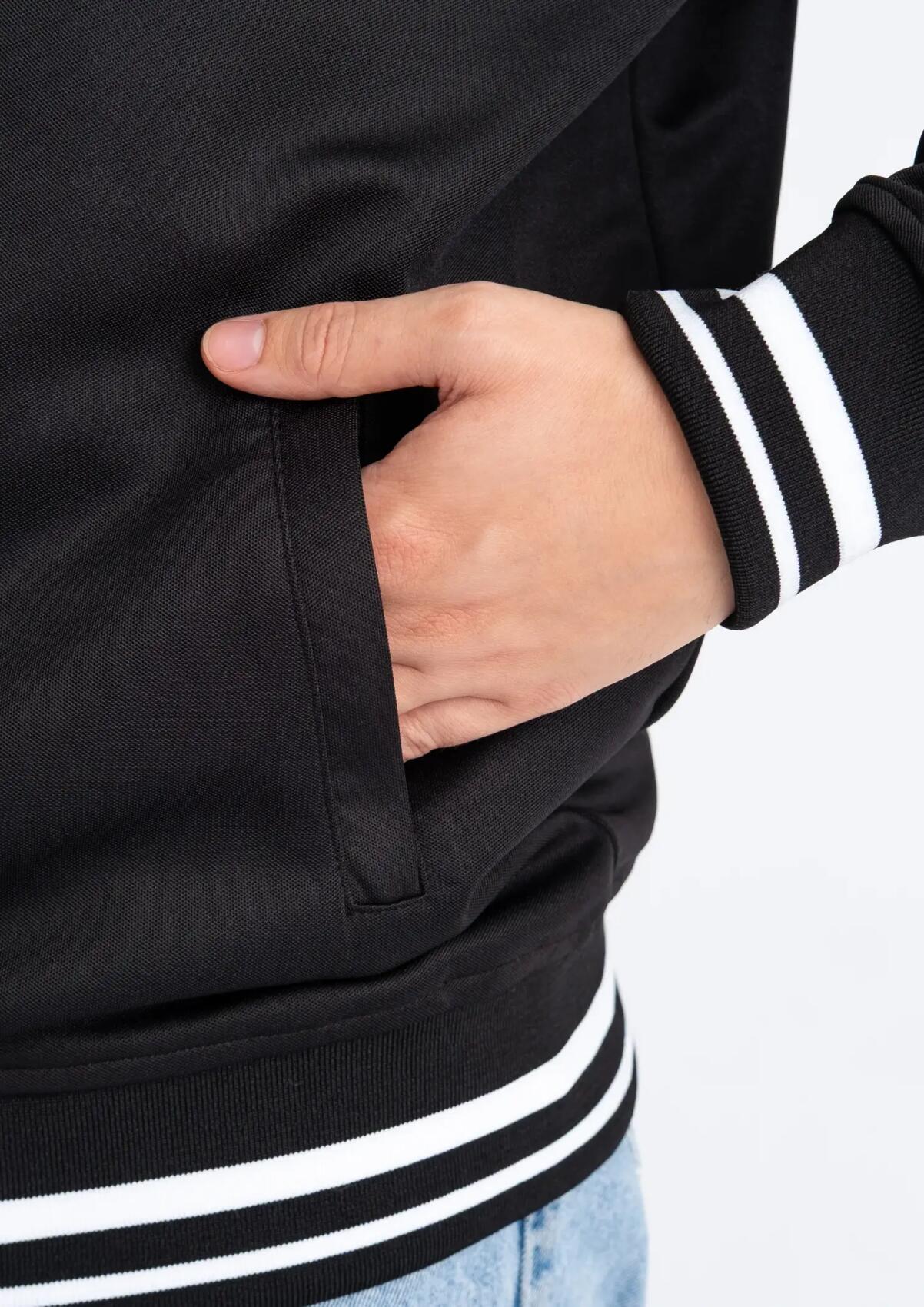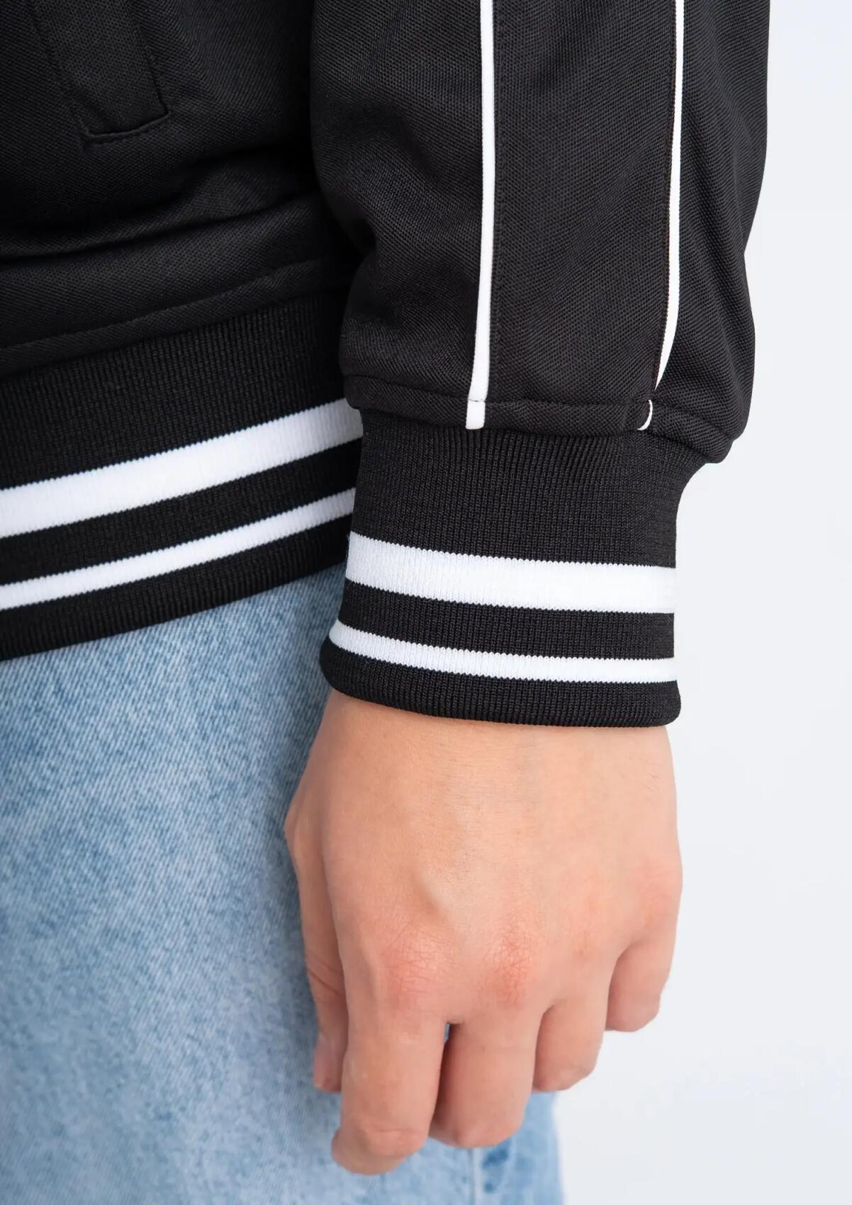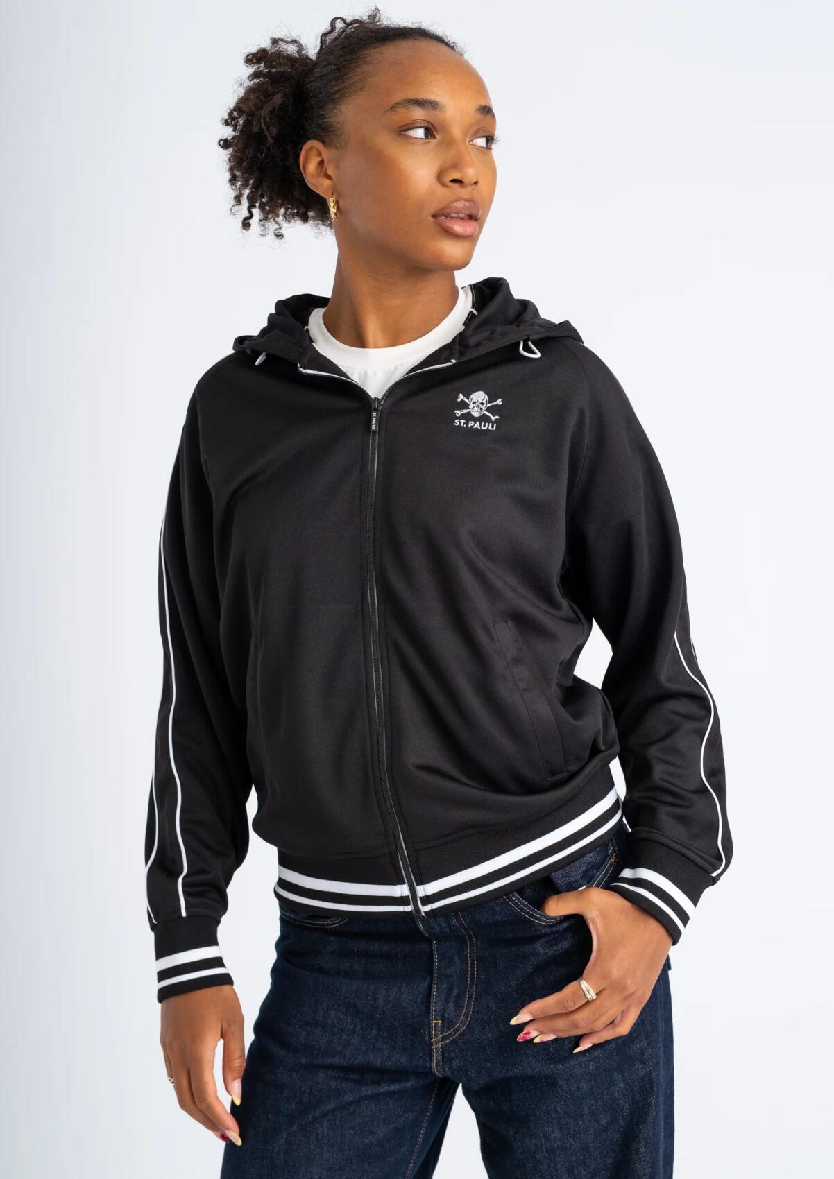 Kick it like ST. PAULI: Klassische Trainingsjacke in Schwarz mit weißen Streifen auf den Ärmeln und unserem Totenkopflogo auf der Brust. Rippbündchen am Stehkragen und den Armen sowie Seitentaschen und ein schwarz-weißer Reißverschluss machen den klassischen Look der Unisex Trainingsjacke komplett. Sie besteht zu 100% aus recyceltem Polyester und wird in der Türkei hergestellt.