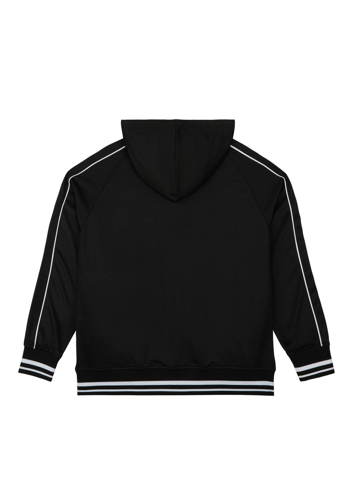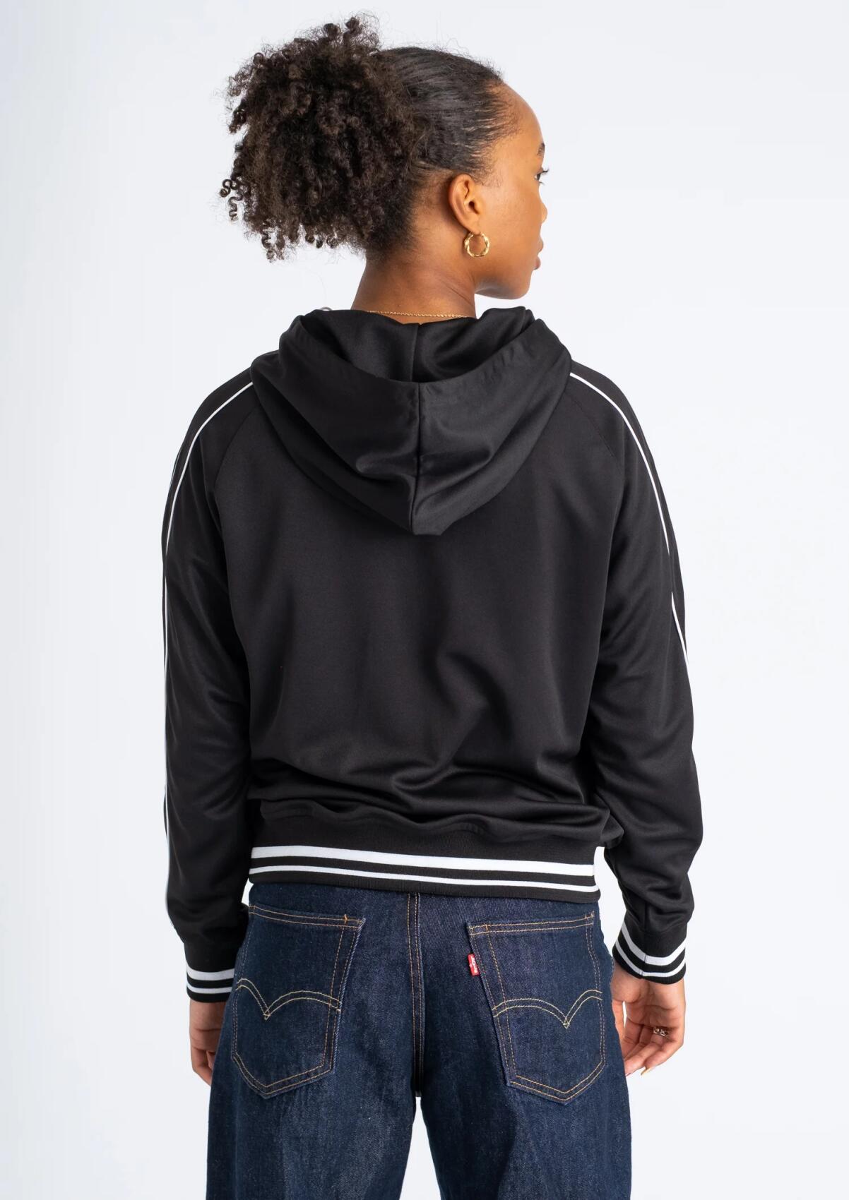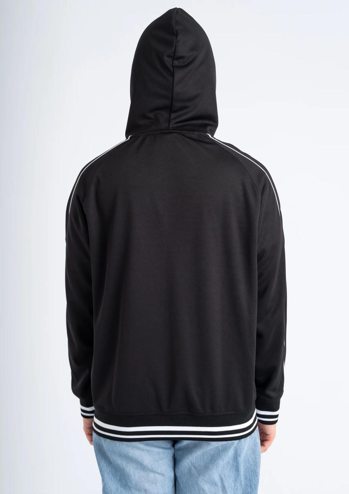Kick it like ST. PAULI: Klassische Trainingsjacke in Schwarz mit weißen Streifen auf den Ärmeln und unserem Totenkopflogo auf der Brust. Rippbündchen am Stehkragen und den Armen sowie Seitentaschen und ein schwarz-weißer Reißverschluss machen den klassischen Look der Unisex Trainingsjacke komplett. Sie besteht zu 100% aus recyceltem Polyester und wird in der Türkei hergestellt.